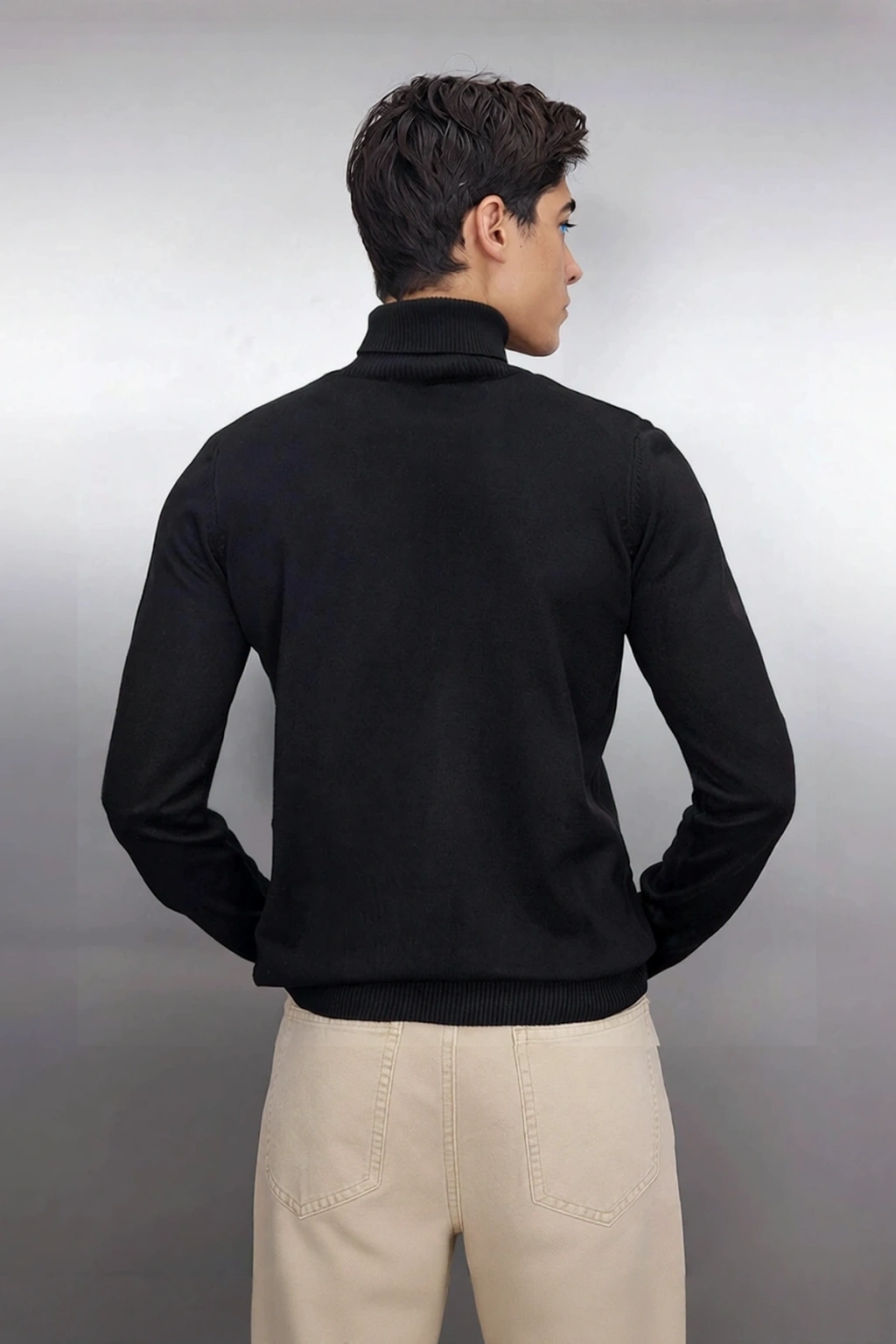 Ürün Özellikleri: Fitted kalıp, akrilik materyal, düz desen, balıkçı yaka, standart kol, triko kumaş, siyah renk.