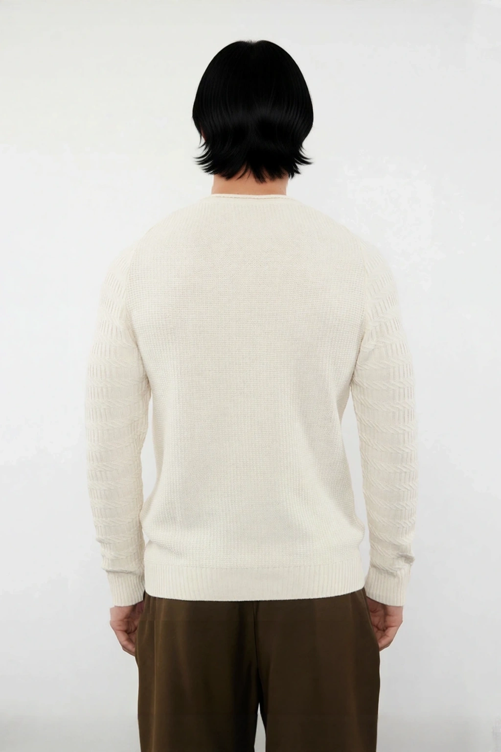 Ürün Özellikleri: Fitted kalıp, akrilik materyal, dokulu desen, bisiklet yaka, standart kol, triko kumaş, ekru renk.