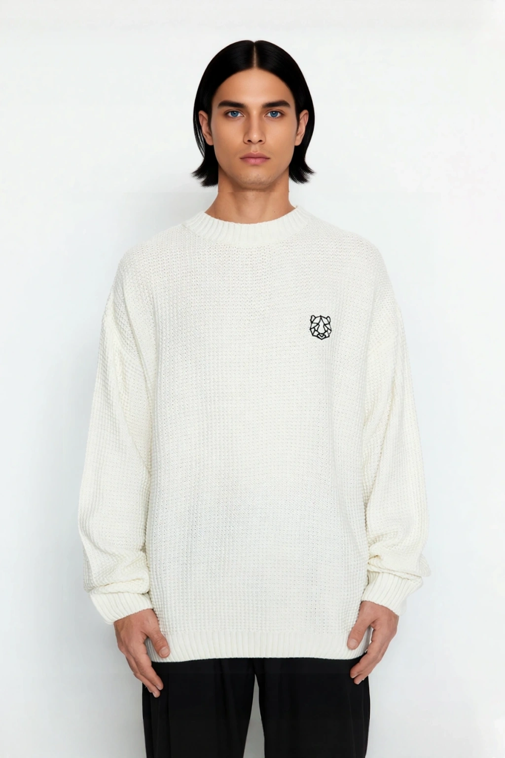 Ürün Özellikleri: Oversize kalıp, %100 akrilik materyal, animal desen, bisiklet yaka, standart kol, triko kumaş, ekru renk, sargı nakış.