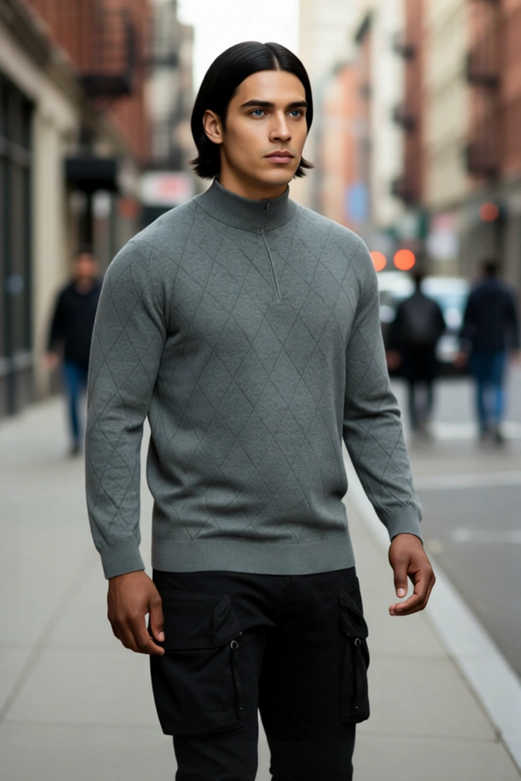 Ürün Özellikleri: Regular kalıp, pamuklu materyal, baklava desen, dik yaka, standart kol, triko kumaş, gri renk, baskısız tasarım, uzun kol, ince kalınlık.