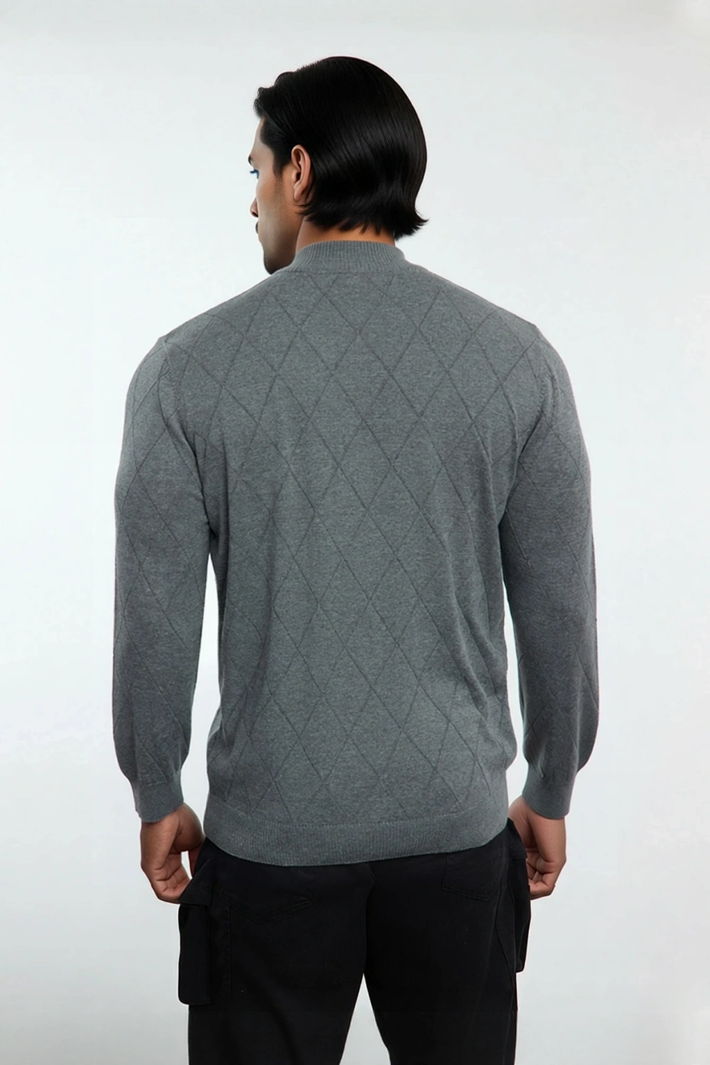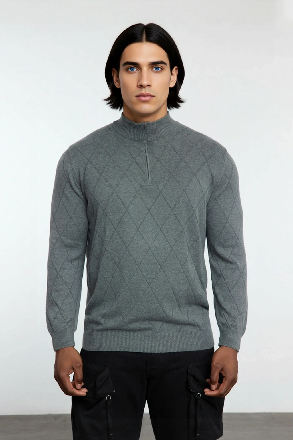 Ürün Özellikleri: Regular kalıp, pamuklu materyal, baklava desen, dik yaka, standart kol, triko kumaş, gri renk, baskısız tasarım, uzun kol, ince kalınlık.
