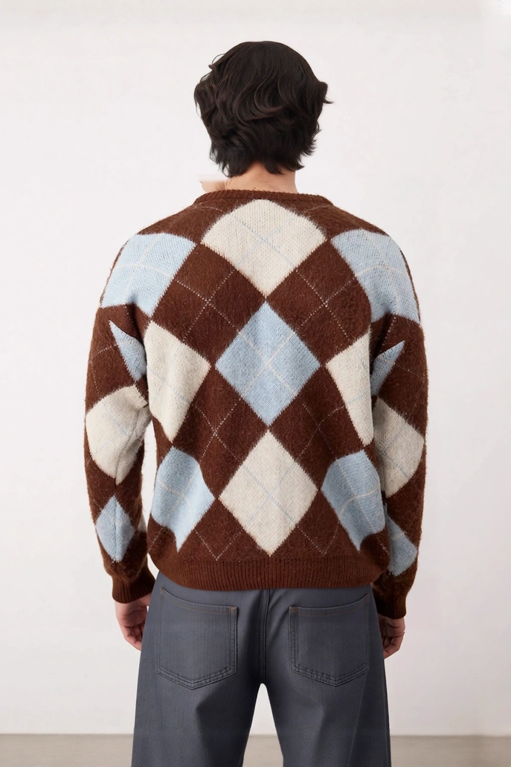 Bu erkek kazak, günlük kullanım için özel olarak tasarlanmış regular kesimi ile maksimum konfor ve stil sunar. Kış aylarının vazgeçilmezi olan bu parça, %98 akrilik, %1 yün ve %1 poliamid içeren materyal bileşeni sayesinde hem sıcak tutar hem de cildinize nazik bir dokunuş sağlar. Çok renkli ekose deseni (kahverengi, açık mavi ve krem), klasik motifleri modern bir dokunuşla yorumlayarak benzersiz ve çekici bir görünüm oluşturur. "Cool & Comfort" personasını yansıtan bu kazak, her anınızda rahatlık ve şıklığı bir arada yaşatır.