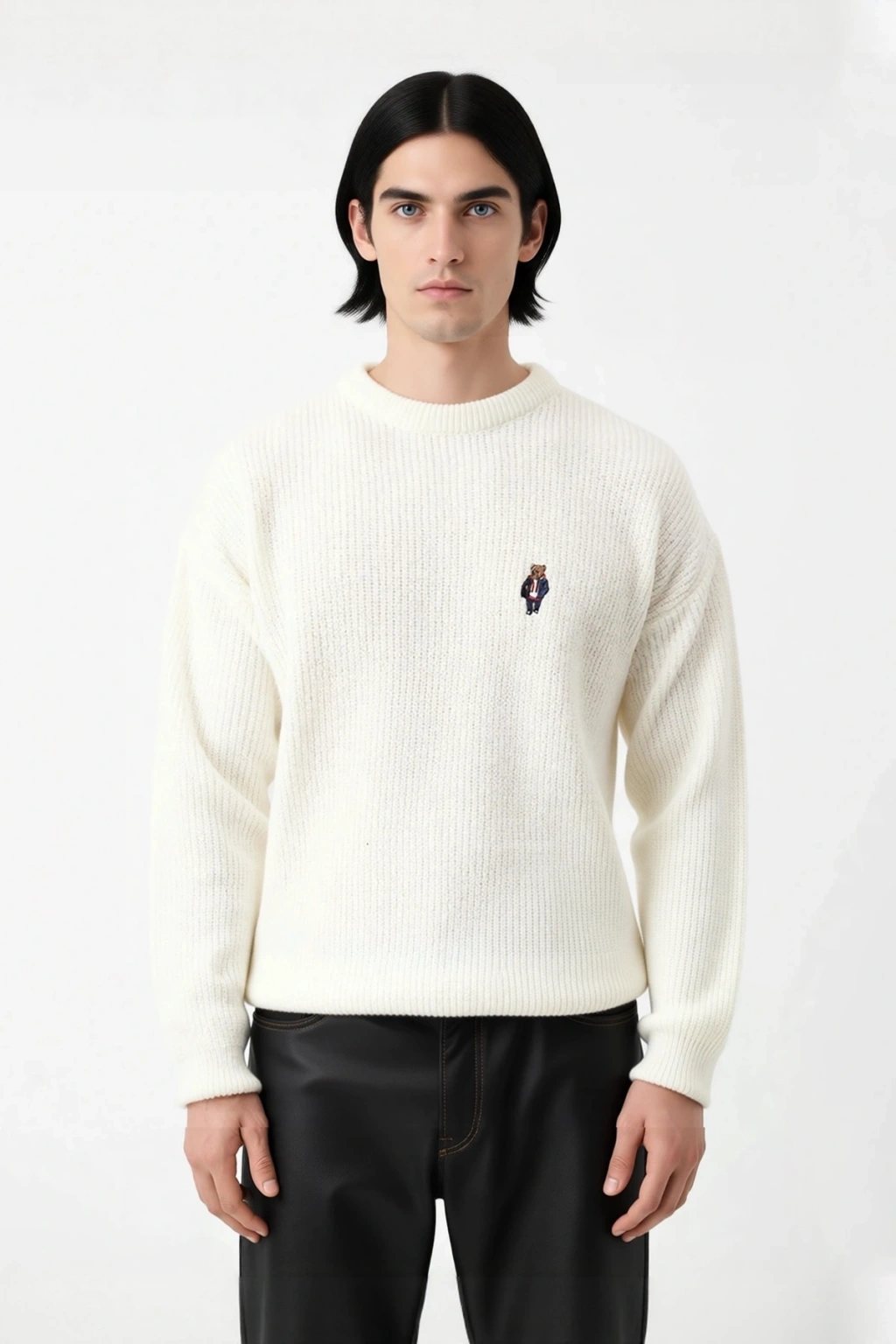 Ürün Özellikleri: Oversize kalıp, akrilik - polyester materyal, ayı nakışlı desen, bisiklet yaka, standart kol, triko kumaş, ekru renk, uzun kol boyu, regular boy, selanik dokuma.