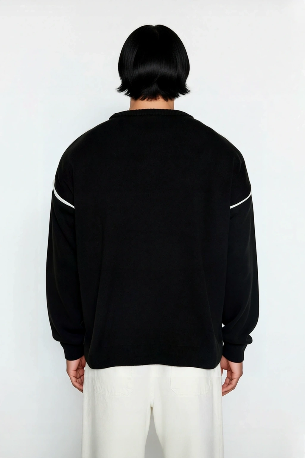 Ürün Özellikleri: Oversize kalıp, akrilik materyal, biye detaylı desen, bisiklet yaka, düşük kol, triko kumaş, siyah renk.