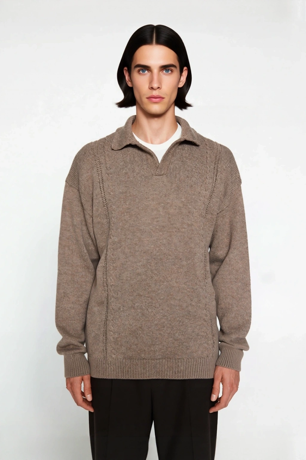Ürün Özellikleri: Oversize kalıp, akrilik, polyester, yün karışımı materyal, düz desen, polo yaka, standart kol, triko kumaş, kahverengi renk.