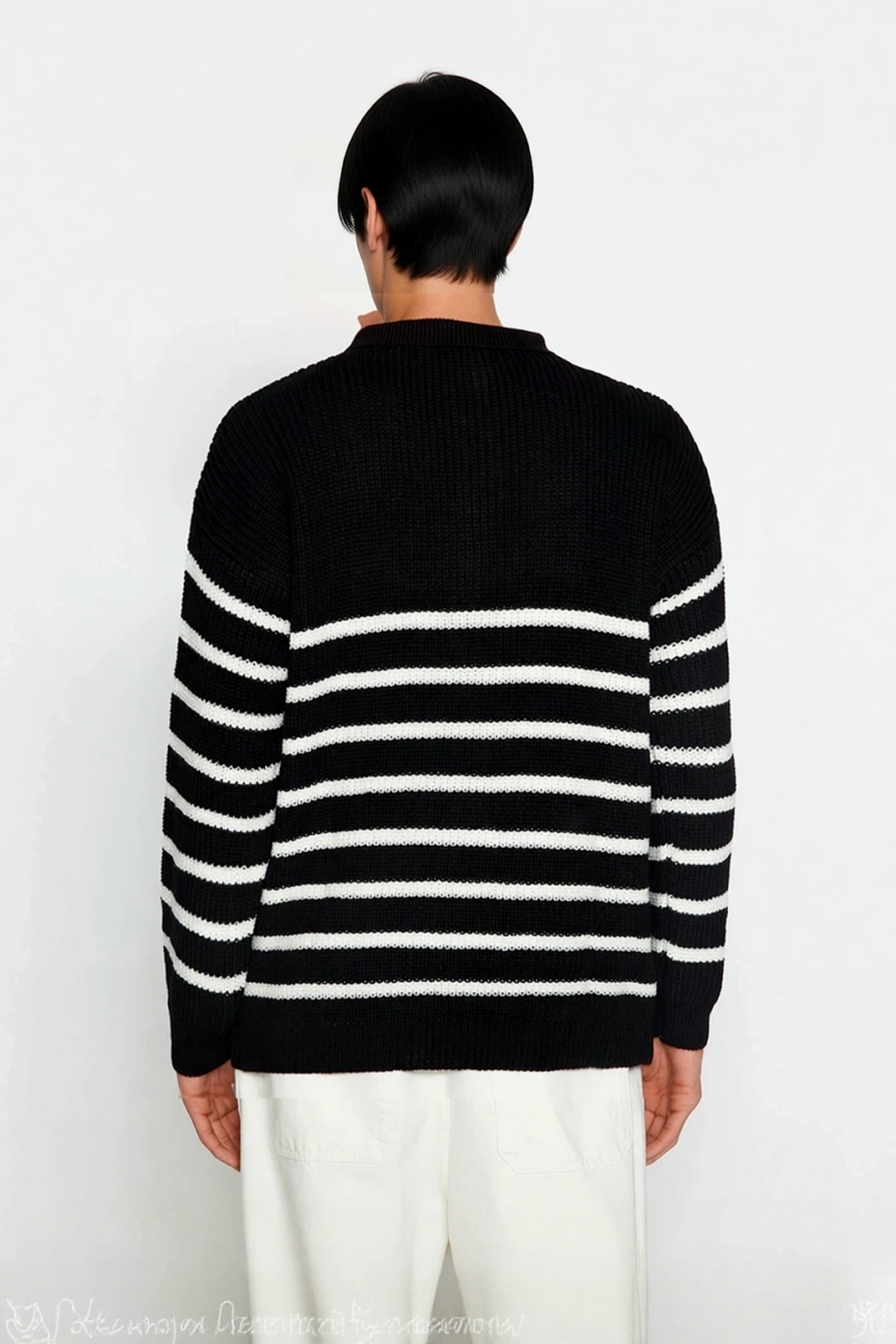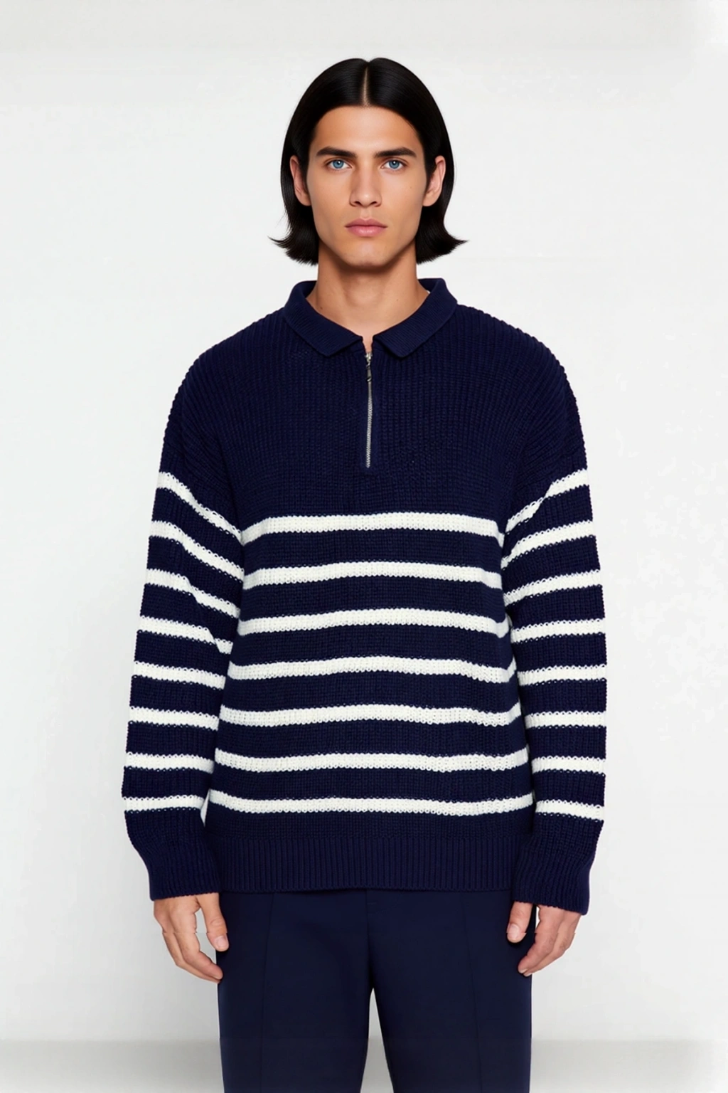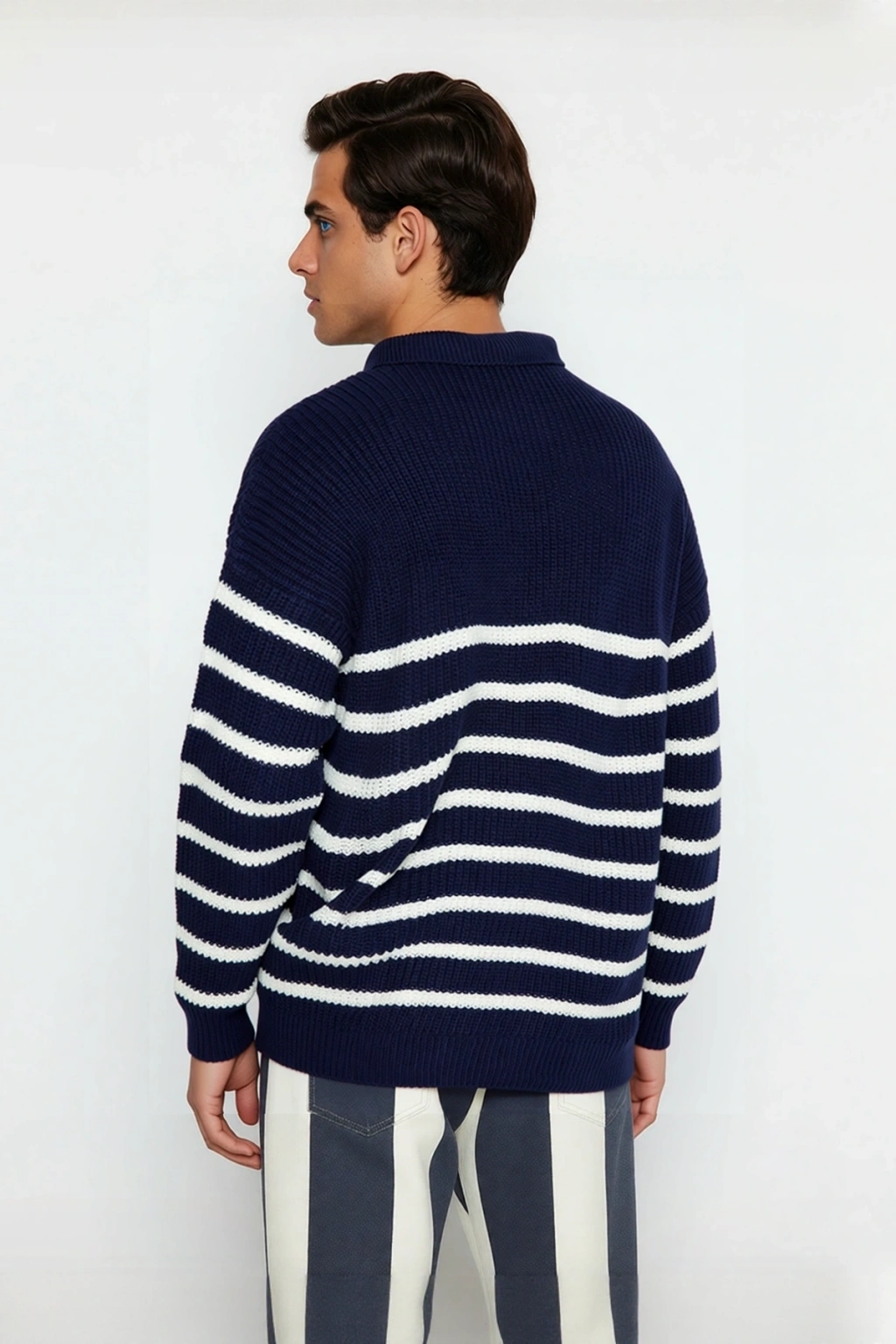 Ürün Özellikleri: Oversize kalıp, %100 akrilik materyal, çizgili desen, polo yaka, standart kol, triko kumaş, lacivert renk, baskısız tasarım, selanik dokuma.