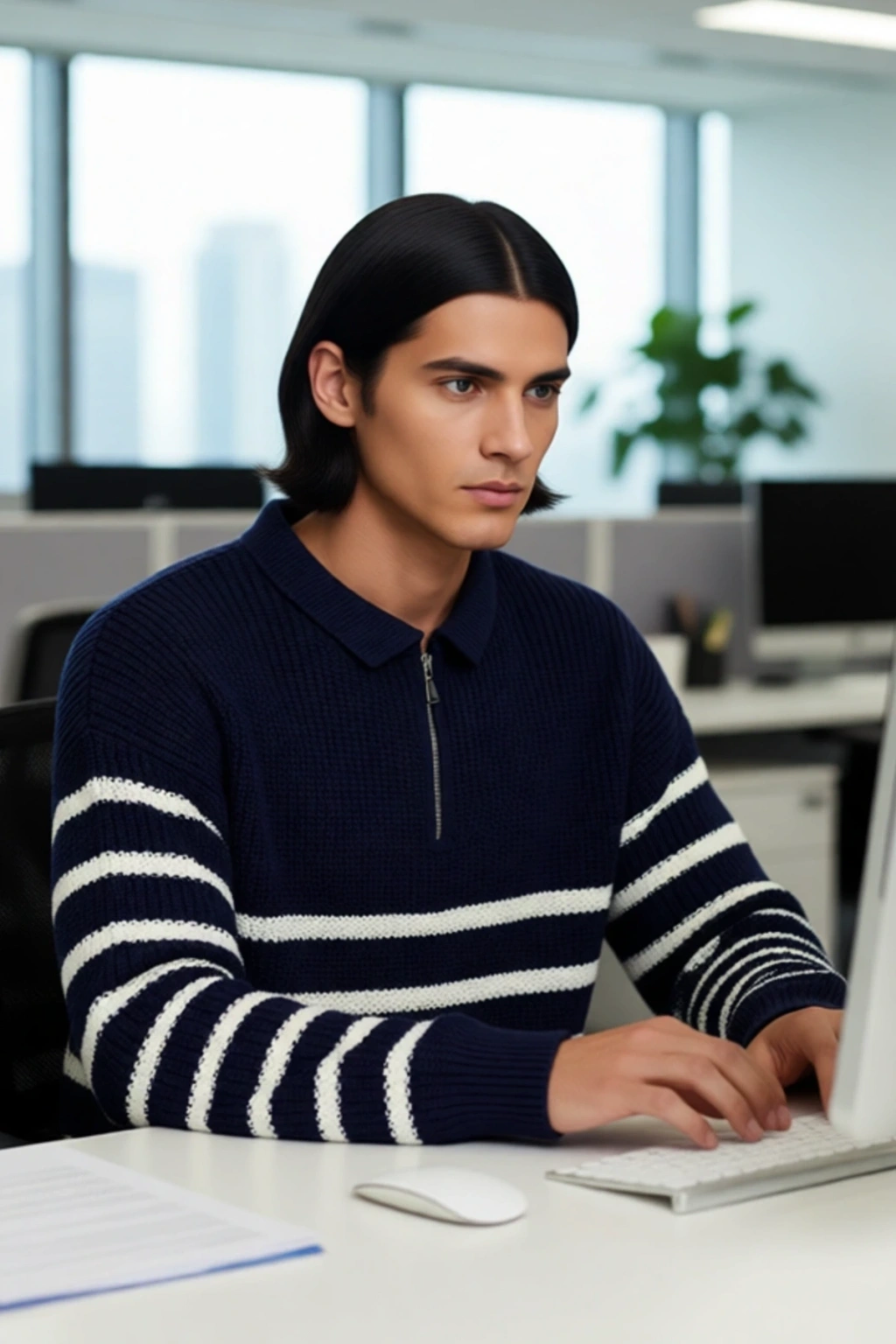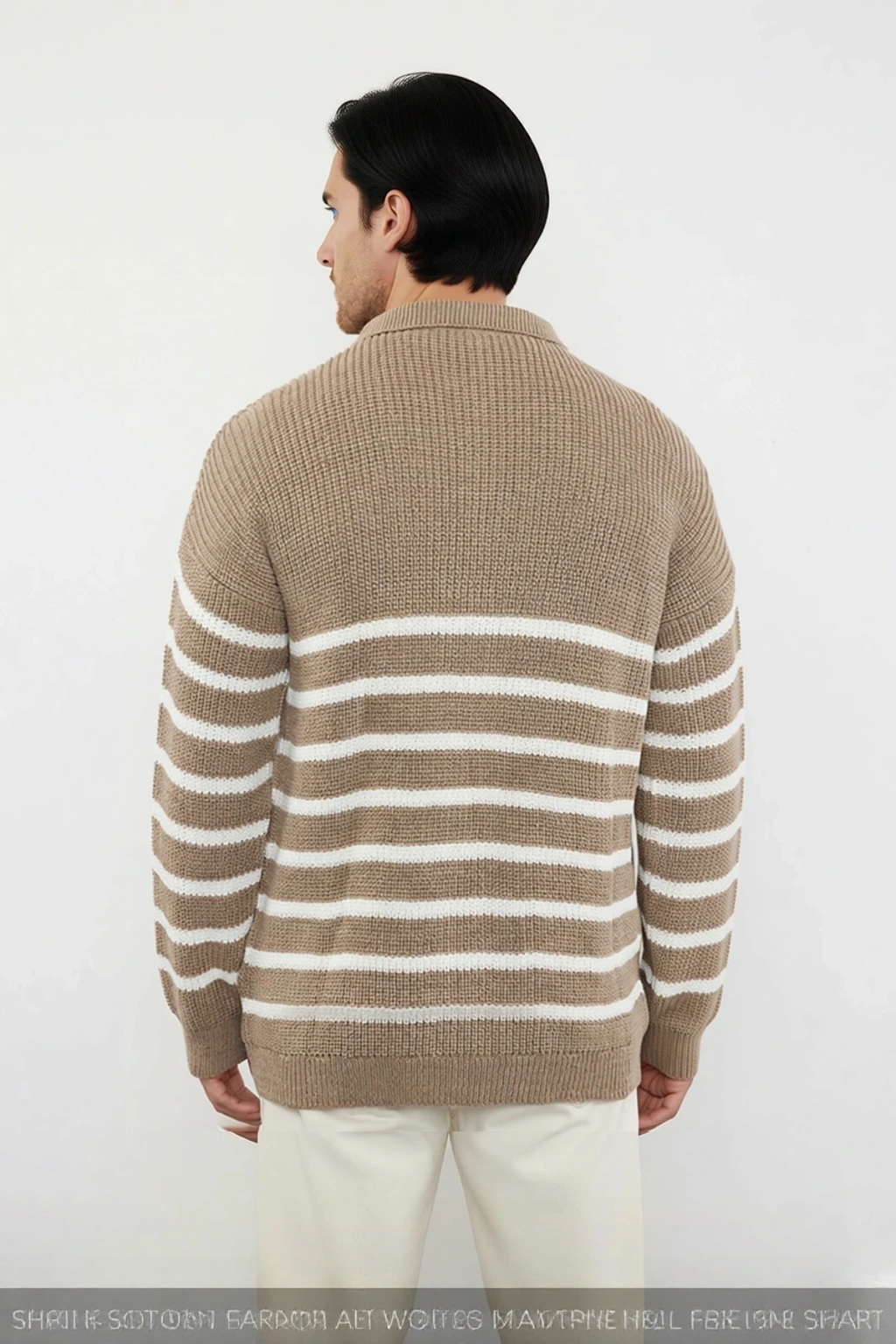 Erkek polo yaka oversize triko kazak, soğuk kış günlerinde stil ve konforu bir araya getiren ideal bir seçenektir. %100 akrilik materyali sayesinde inanılmaz derecede yumuşak bir doku sunarken, aynı zamanda üstün sıcaklık ve dayanıklılık sağlar. Geniş ve rahat kalıbı, modern ve özgür bir siluet oluşturarak gün boyu rahat bir kullanım vadediyor. Lacivert rengi ve dikkat çekici çizgili deseni, kazağa denizci esintili klasik bir hava katarken, baskısız yüzeyi minimalist bir şıklık sunar. Cool ve konforlu persona özelliğiyle her an kendinizi iyi hissetmenizi sağlar.