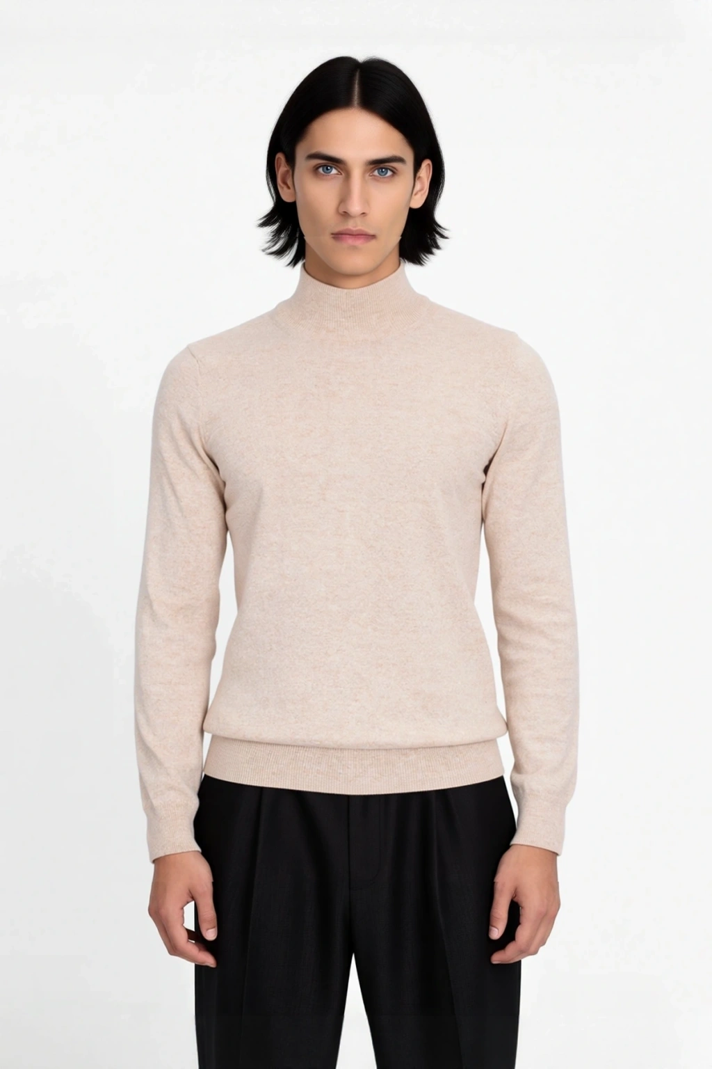 Ürün Özellikleri: Fitted kalıp, akrilik polyester yün karışımlı materyal, düz desen, yarım balıkçı yaka, standart kol, triko kumaş, bej renk, baskısız tasarım.