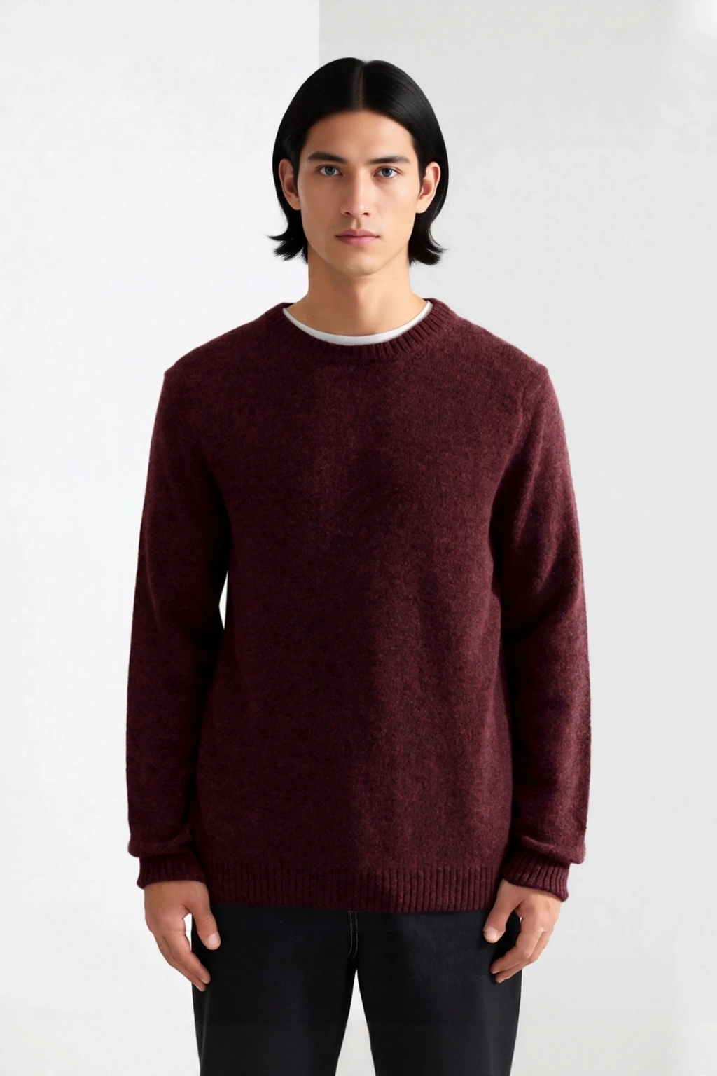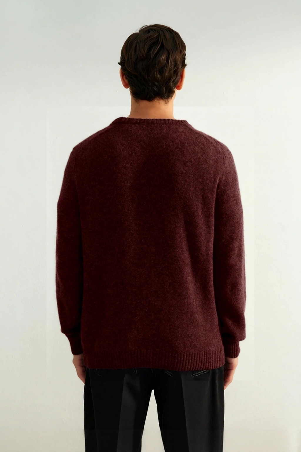 Ürün Özellikleri: Regular kalıp, yünlü materyal, düz desen, bisiklet yaka, standart kol, triko kumaş, bordo renk, cepsiz tasarım.