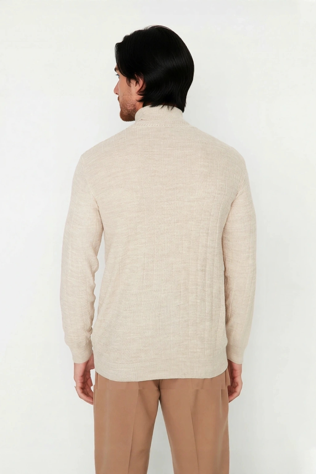 Ürün Özellikleri: Regular kalıp, akrilik materyal, düz desen, balıkçı yaka, standart kol, triko kumaş, bej renk, baskısız tasarım, cepsiz.
