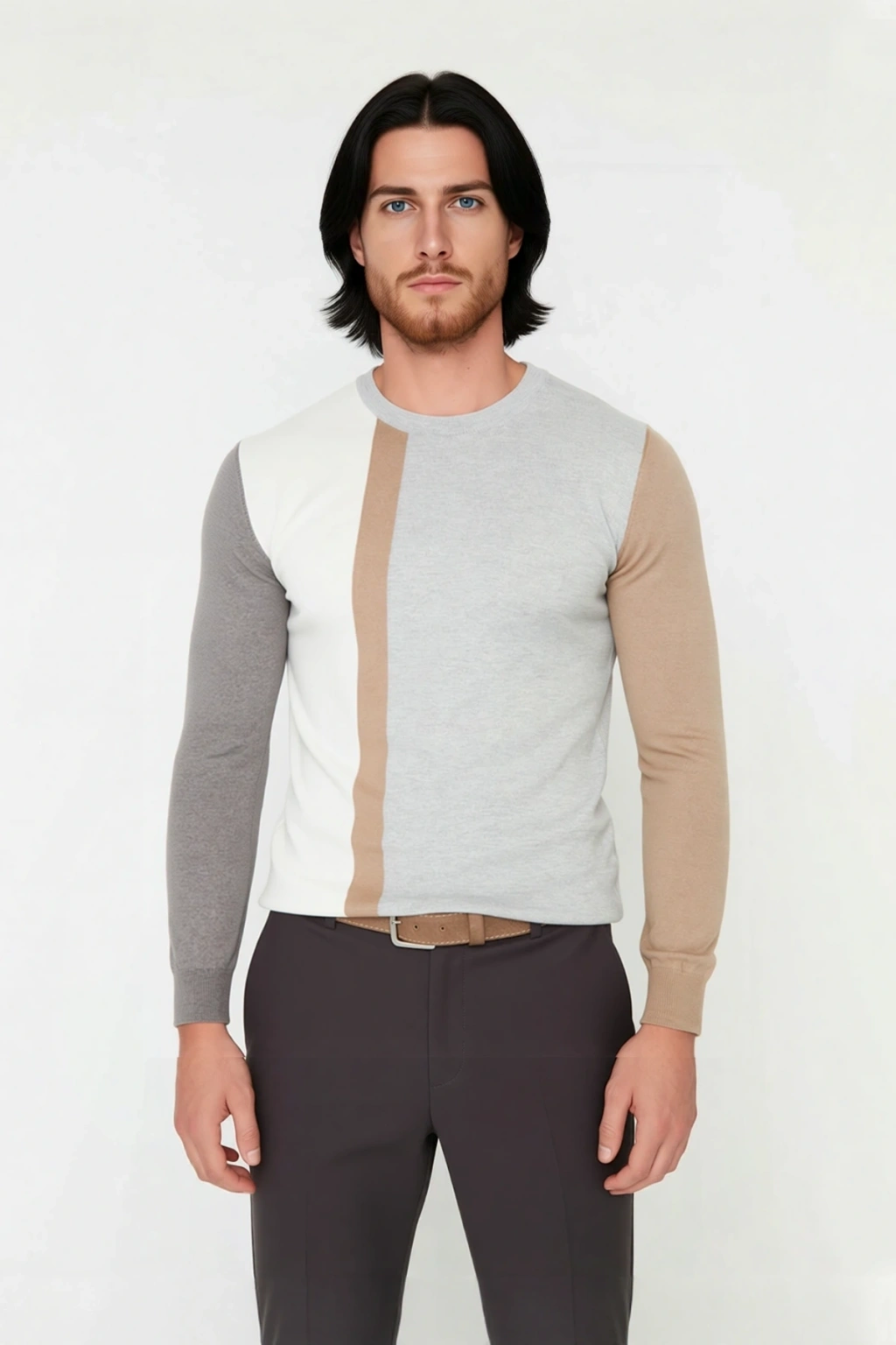 Bu erkek triko kazak, fitted kalıbı ile modern ve vücuda oturan şık bir duruş sergiler. Yüksek kaliteli akrilik ve pamuk karışımı materyali (%50 Akrilik, %50 Pamuk) sayesinde hem hafif bir sıcaklık sunar hem de gün boyu süren yumuşacık bir dokunuş hissi verir. Renk bloklu deseni, gri, beyaz ve bej tonlarının harmonik birleşimiyle dinamik ve göz alıcı bir stil yaratır. Baskısız ve sade tasarımı, minimalist şıklığı tercih eden erkekler için idealdir. Bu kazak, casual ve günlük kullanım için mükemmel bir seçenek olup, rahatlığı ve şıklığı bir arada arayanların favorisi olacak.