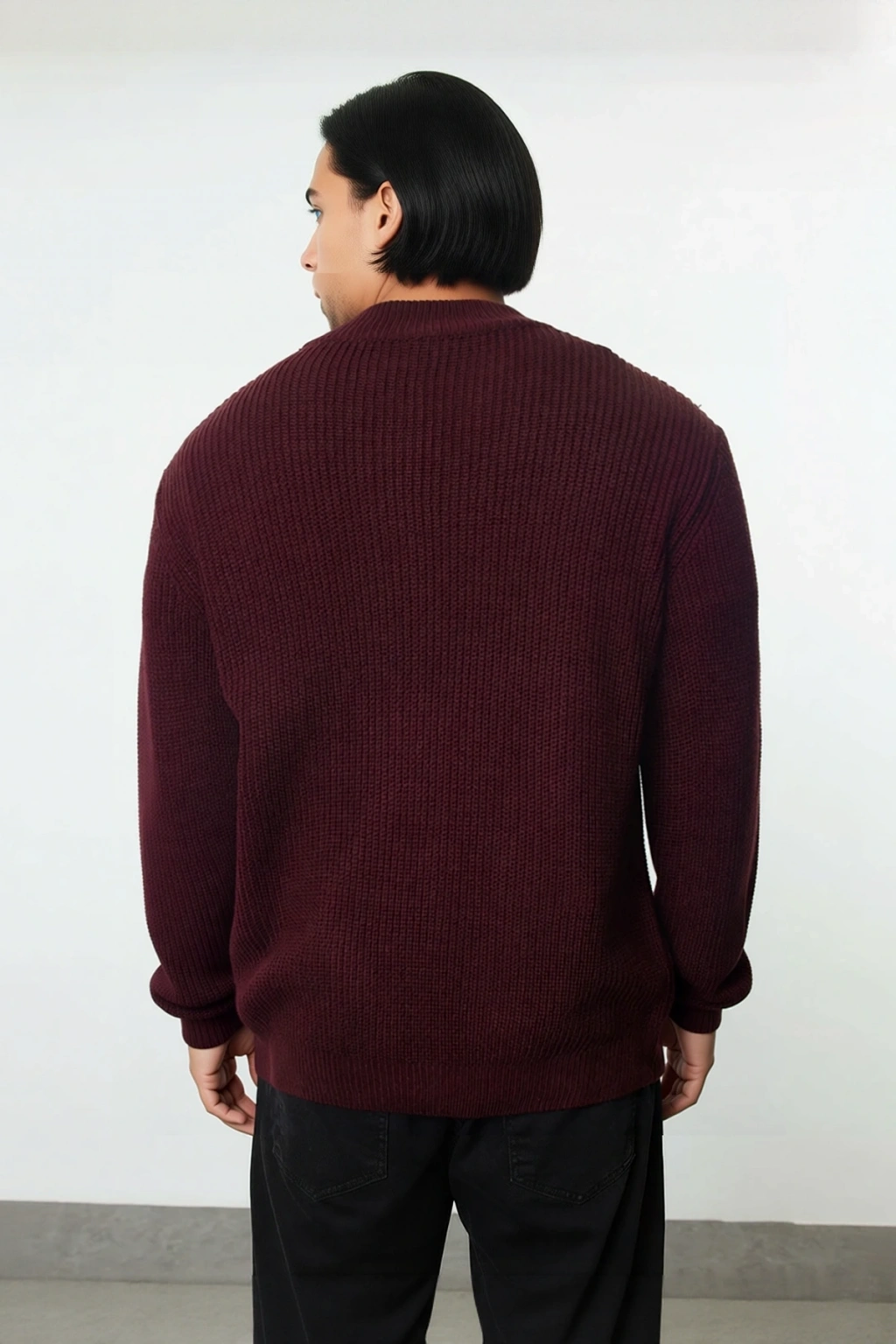 Ürün Özellikleri: Regular kalıp, akrilik materyal, düz desen, dik yaka, standart kol, triko kumaş, bordo renk.