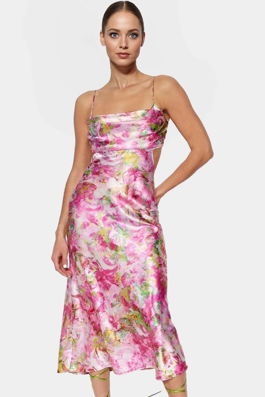 Bu büyüleyici çiçek desenli midi elbise, feminen tarzınızı vurgulamak için tasarlandı. Saten kumaşın zarif dokusu, canlı renkler ve romantik çiçek deseni ile göz alıcı bir görünüm sunuyor. Yaz aylarının sıcak günlerinde ve özel davetlerde şıklığınızdan ödün vermeden rahatlığı yaşayın. Mezuniyet balolarından düğünlere, özel akşam yemeklerinden kokteyllere kadar her ortamda kendinizi özel hissedeceksiniz. Polyester karışımlı saten kumaş, nefes alabilir yapısıyla gün boyu rahatlık sağlar. Düz kesim ve shift kalıbıyla vücut hatlarınıza mükemmel bir uyum sunarken, cut out detayı modern bir hava katıyor. Kolsuz tasarımıyla sıcak yaz günlerinde serin kalmanızı sağlar. Degaje yakası, feminenliğinizi vurgularken, astarsız yapısıyla gün boyu özgürce hareket edebilirsiniz. Kemersiz tasarımı sayesinde dilediğiniz gibi kombinleyebilirsiniz. Elbisenin midi boyu, farklı vücut tiplerine uygundur. Modelin ölçüleri: Boy 179 cm, Göğüs 75 cm, Bel 59 cm, Kalça 87 cm. Modelimiz S beden giymiştir. Ürününüzü uzun süre kullanabilmek için, yıkama talimatlarına uymanız önemlidir. Stüdyo çekimlerinde ışık farklılıklarından dolayı renklerde küçük değişiklikler olabilir. - Kumaş Tipi: Dokuma - Materyal: Polyester Karışımlı (95% Polyester, 5% Elastan) - Desen: Çiçekli - Kalıp: Shift - Kol Tipi: Standart Kol - Yaka Tipi: Degaje Yaka - Kol Boyu: Kolsuz - Ürün Detayı: Cut outlı - Cep: Cepsiz - Astar Durumu: Astarsız - Boy: Midi - Persona: Feminine - Siluet: Shift - Ortam: Mezuniyet/Balo - Dokuma Tipi: Saten - Ek Özellik: Düz Kesim - Kemer/Kuşak Durumu: Kemersiz - Sürdürülebilirlik Detayı: Hayır - Sezon: Yaz - Menşei: TR - Model Ön Boyu: 125,0 cm