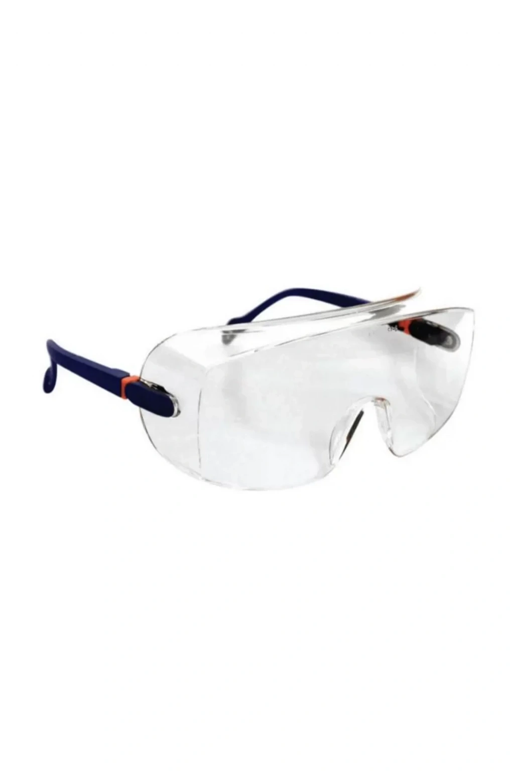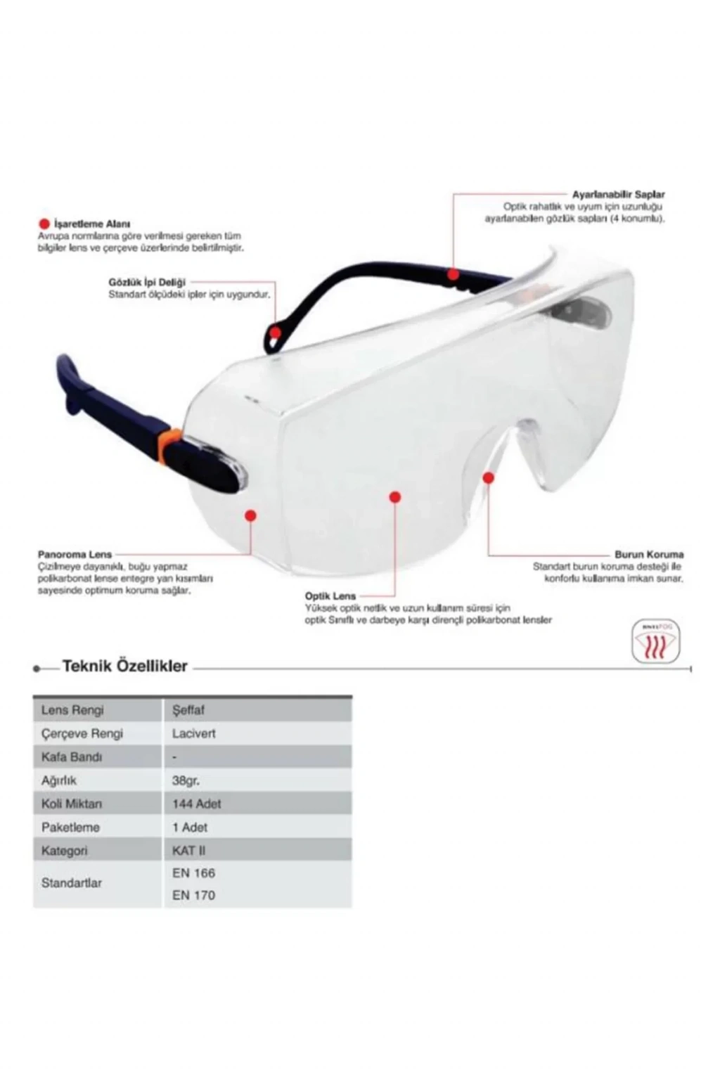 Görüntülerdeki gibi lacivert saplara ve şeffaf, geniş camlara sahiptir. Ergonomik tasarımıyla kullanım kolaylığı sağlar. Buğu önleyici özelliği sayesinde, yoğun çalışma koşullarında veya buharlı ortamlarda daima net görüş imkanı sunar.