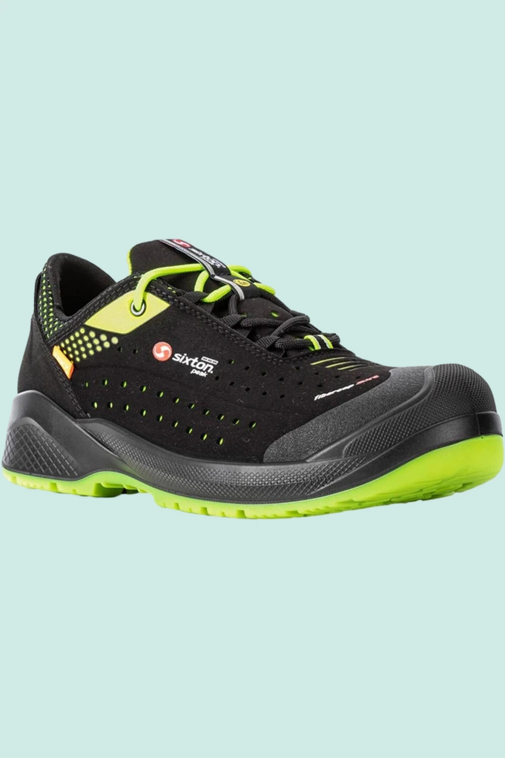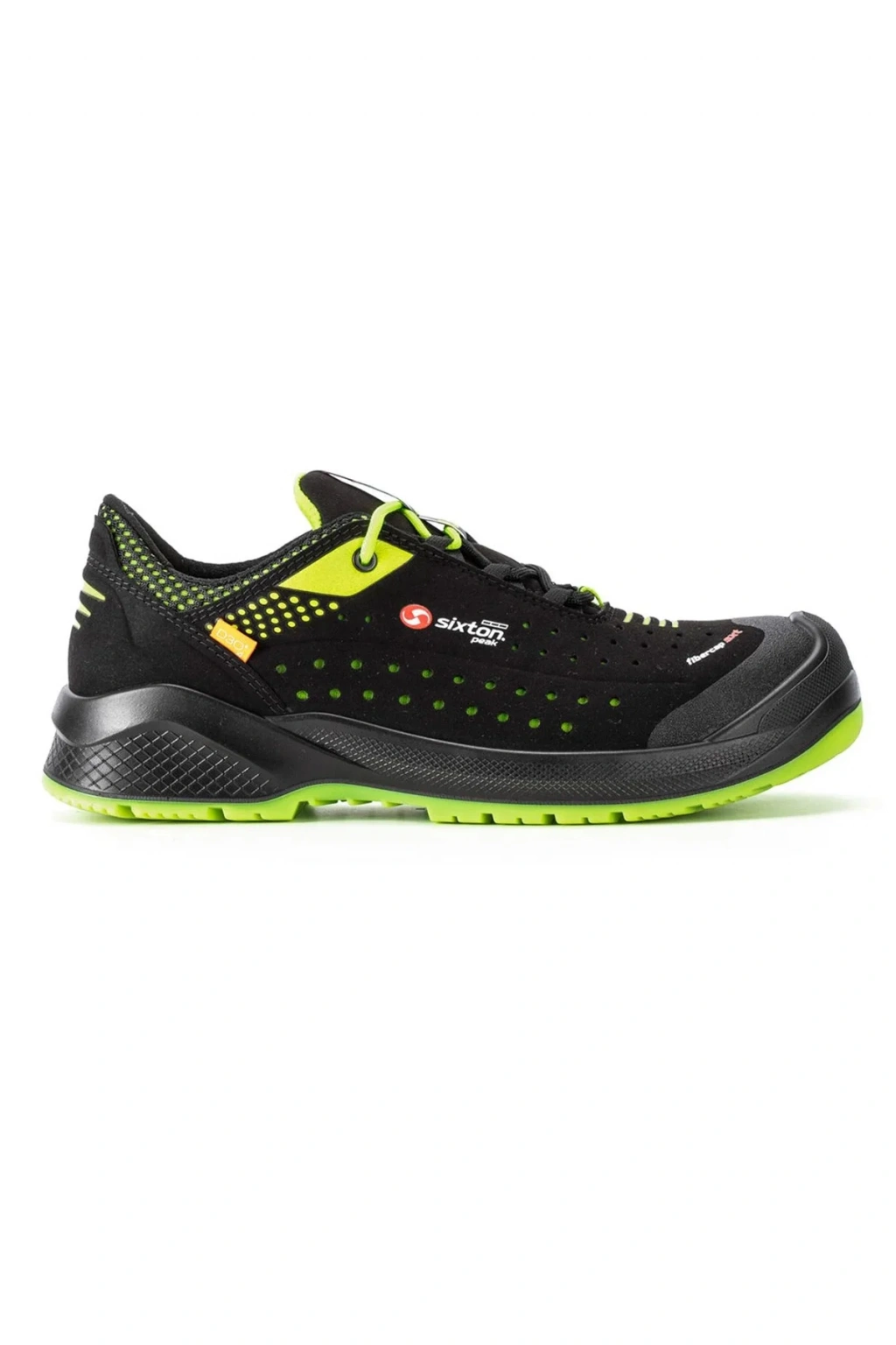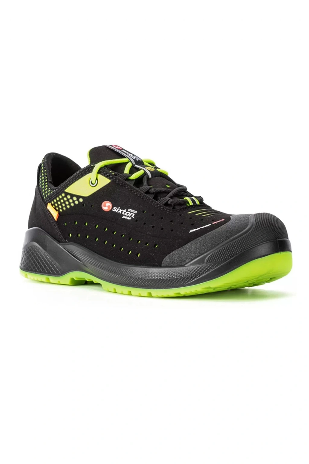 Sixton marka, siyah ve neon yeşil renkli, delikli iş güvenliği ayakkabısı. Hem şık hem de güvenli bir çalışma ortamı için idealdir.