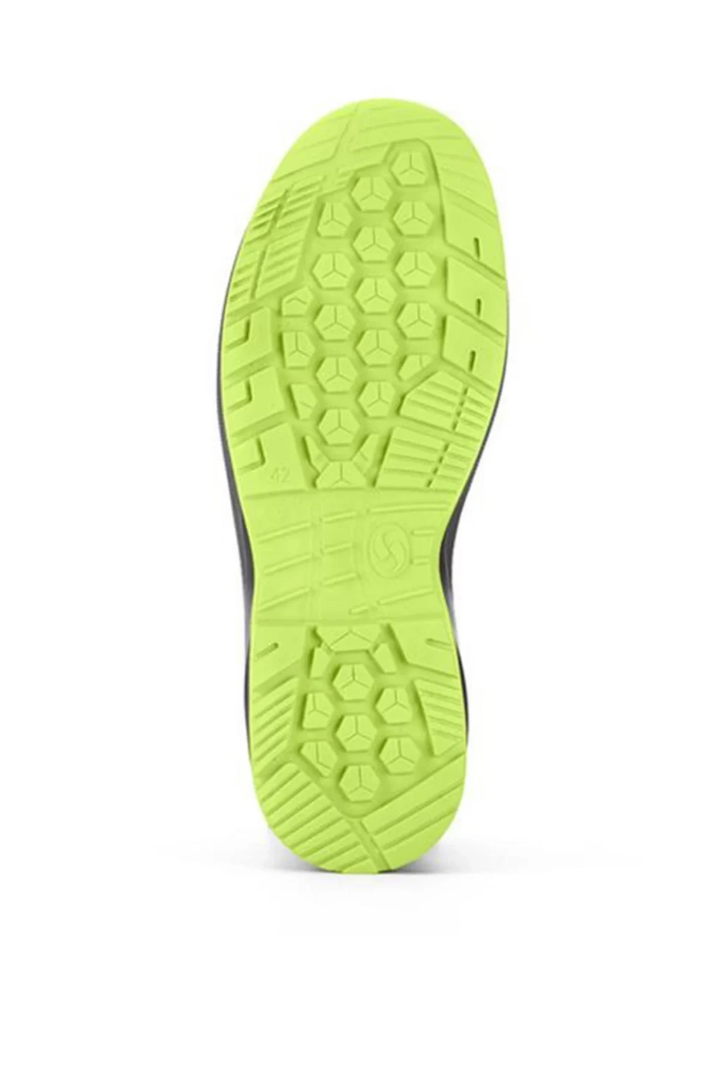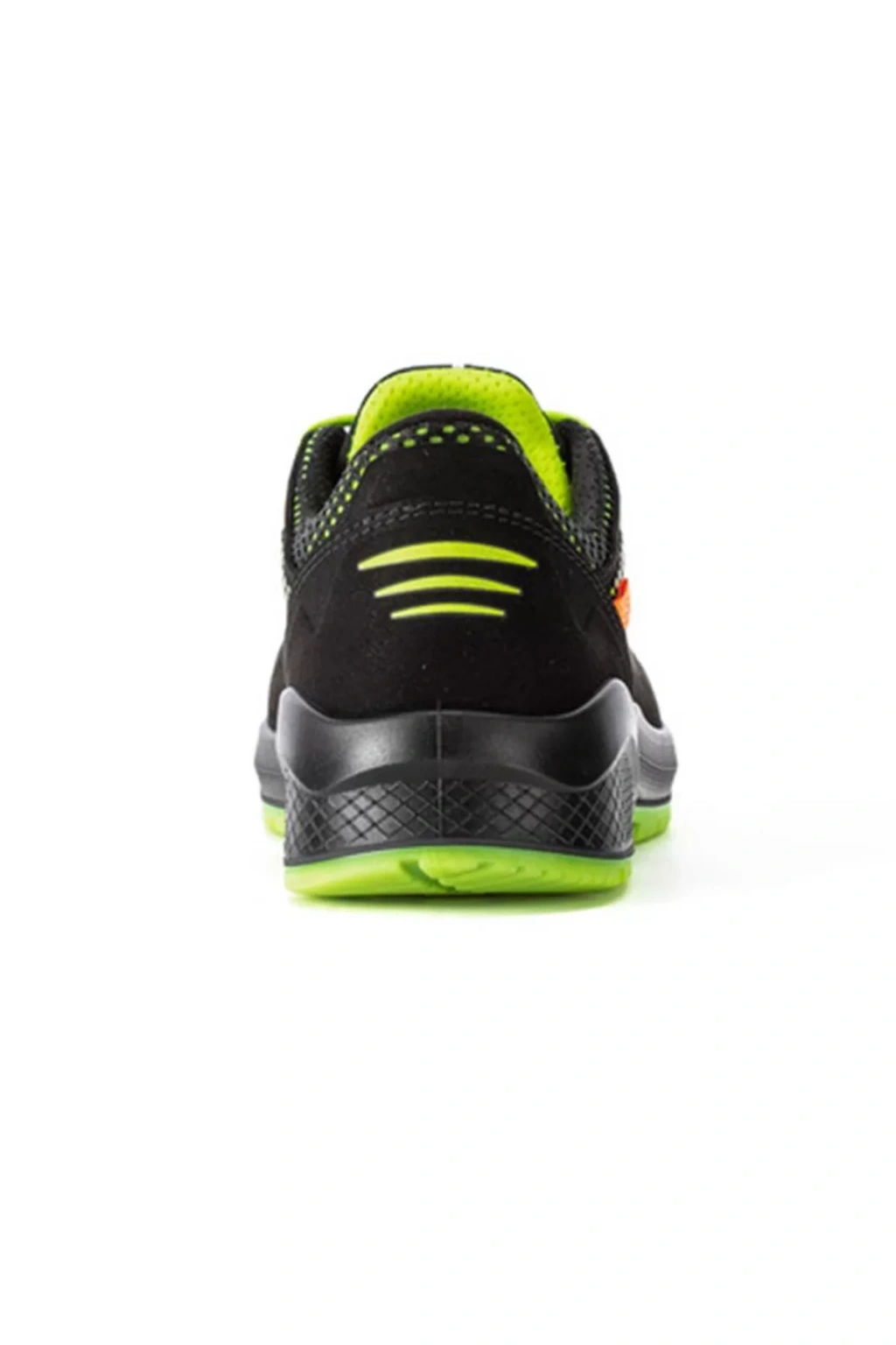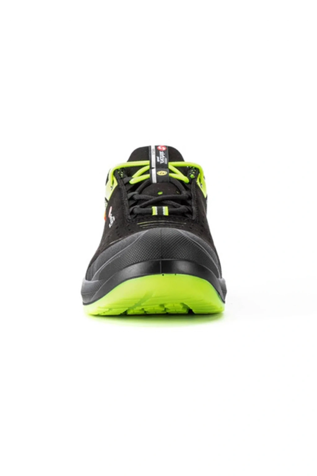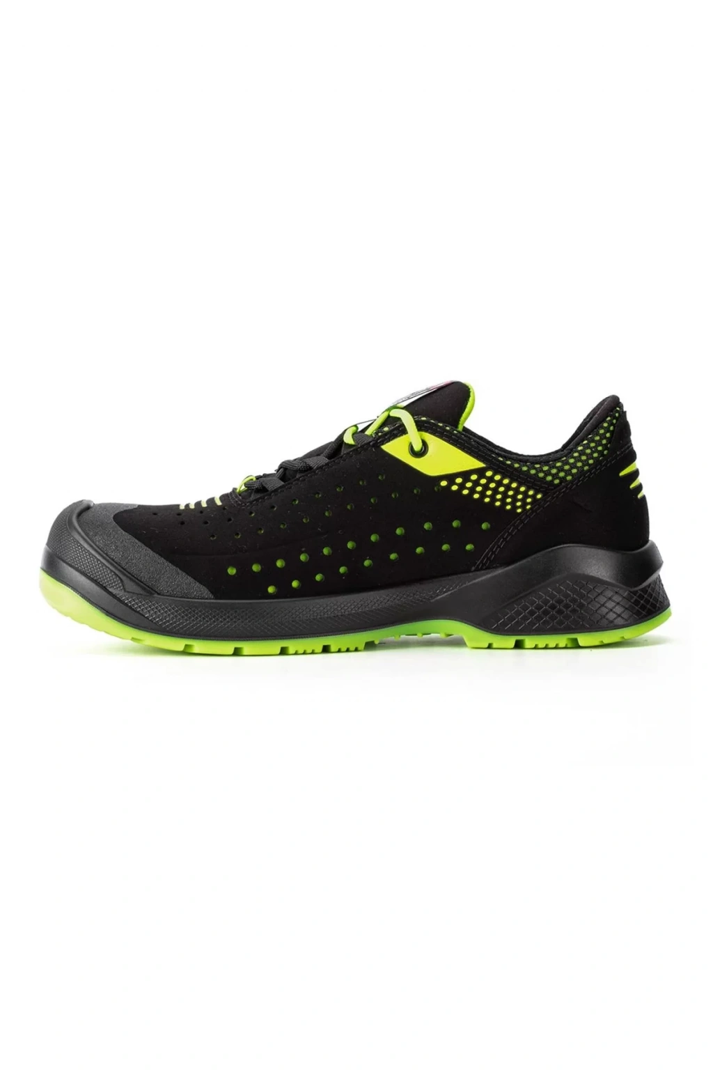 Sixton marka, siyah ve neon yeşil renkli, delikli iş güvenliği ayakkabısı. Hem şık hem de güvenli bir çalışma ortamı için idealdir.