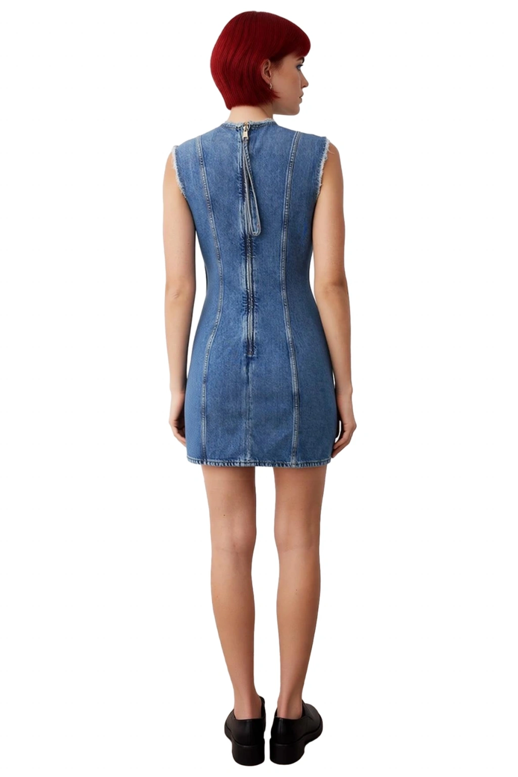 Kolsuz tasarımı sayesinde özellikle sıcak havalarda ferah bir kullanım sunarken, bisiklet yaka detayı elbiseye sade ve zarif bir hava katar. Omuz ve yaka çevresindeki hafif yıpranmış kenar detayları, bu denim elbiseye modern ve özgün bir karakter kazandırır. Rigid dokuma tipi, kumaşın formunu korumasına yardımcı olurken, astarsız yapısı ile hafif bir giyim deneyimi sunar. %100 pamuk içeriği sayesinde yumuşak bir dokunuşa sahiptir ve makinede kolayca yıkanabilir olması, pratik kullanım açısından büyük avantaj sağlar, böylece her zaman şık kalabilirsiniz.
