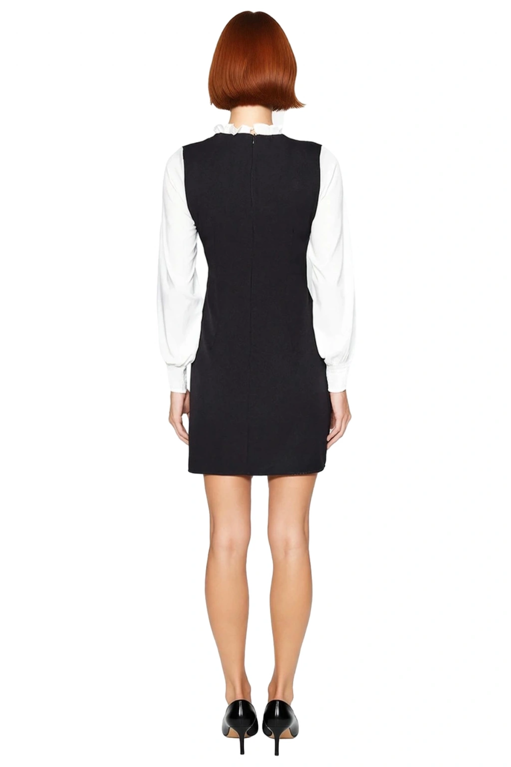 Elbisenin fırfırlı dik yaka tasarımı, klasik bir zarafet katarken modern bir dokunuş sunar. Standart kol yapısı, uzun kollu tasarımıyla birleşerek hem şık hem de rahat bir kullanım sağlar. Dokuma kumaş tipi, kaliteli duruşuyla dikkat çekerken, astarsız yapısı hafif ve nefes alabilir bir giyim deneyimi sunar. Cepsiz ve kemersiz oluşu, elbisenin sade ve minimalist çizgisini vurgular. Makinede yıkanabilir özelliği sayesinde bakımı oldukça kolaydır, bu da yoğun iş temposuna sahip kadınlar için pratik bir avantajdır. Uzun ömürlü yapısıyla gardırobunuzun vazgeçilmez parçası olmaya adaydır.