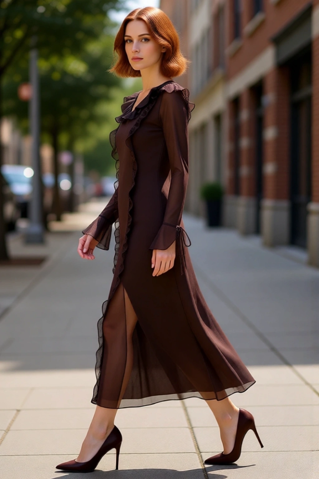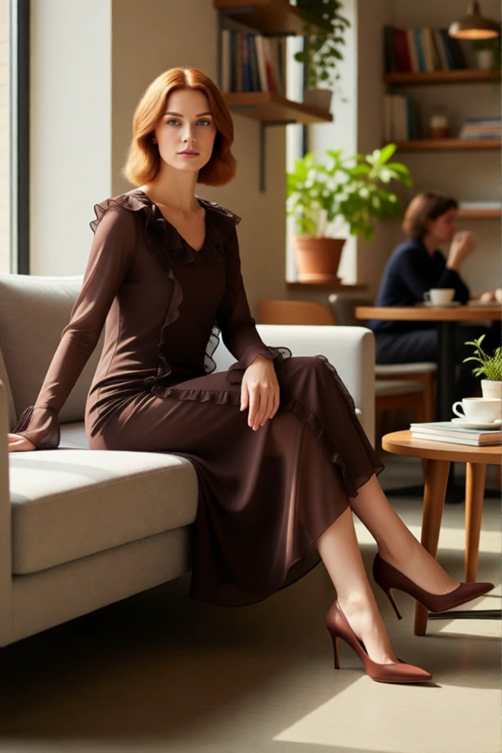 Bu zarif kadın elbisesi, feminen A-line kalıbı ile her vücut tipine uyum sağlayarak akıcı ve şık bir siluet oluşturur. Yüksek kaliteli 94% Polyester ve 6% Elastan materyal bileşimi sayesinde hem hafif hem de esnek bir yapı sunarak gün boyu hareket özgürlüğü sağlar. V yaka tasarımı ve boydan boya uzanan fırfırlı detaylar elbiseye modern ve dinamik bir hava katarken, kahverengi rengi asil ve sıcak bir görünüm sunar. Astarlı yapısı iç göstermeyen konforlu bir kullanım vadederken, düz deseni sade ve sofistike bir stilin kapılarını aralar. Bu elbise, her adımda zarafeti ve rahatlığı bir araya getirerek özel anlarınızda veya günlük yaşamınızda fark yaratır.