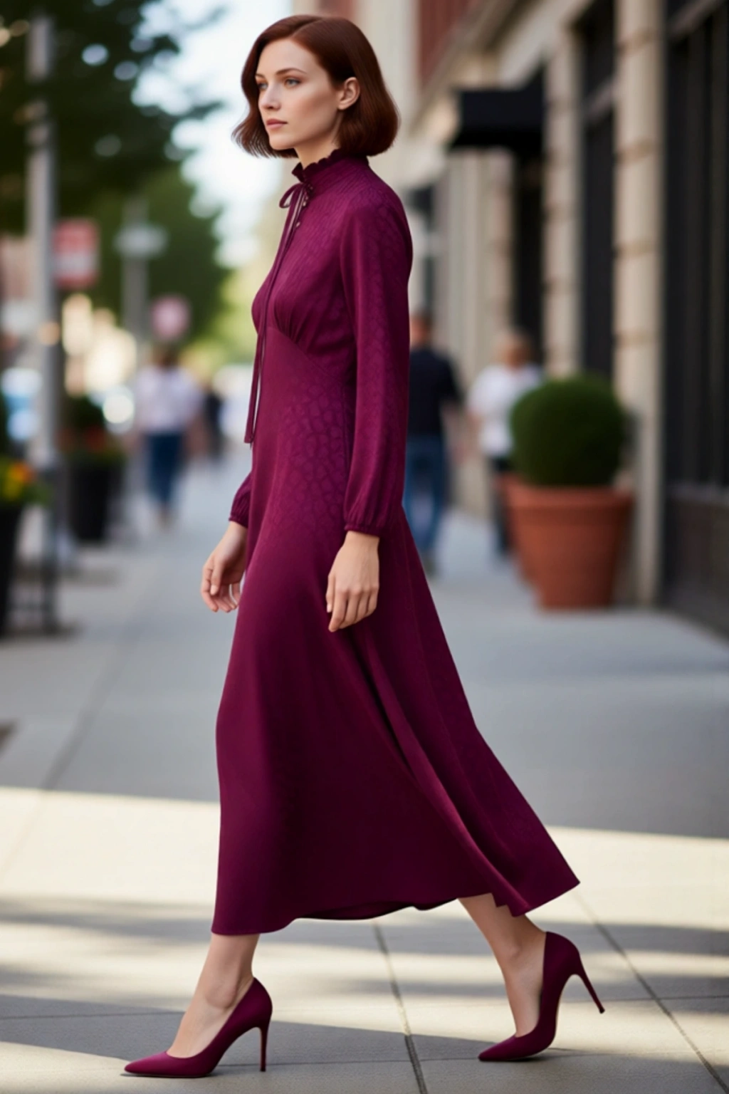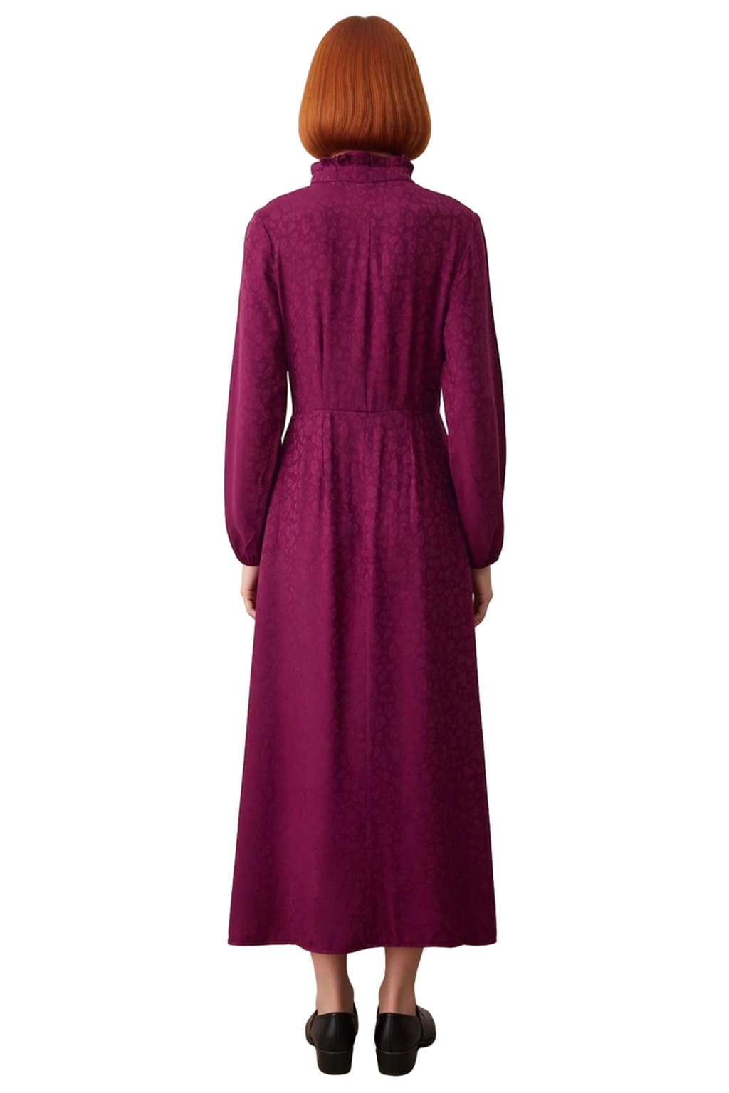 Ürün Özellikleri: A-line kalıp, viskoz polyester materyal, jakar desen, fırfırlı yüksek yaka, uzun kol, dokuma kumaş, mor renk, astarsız.