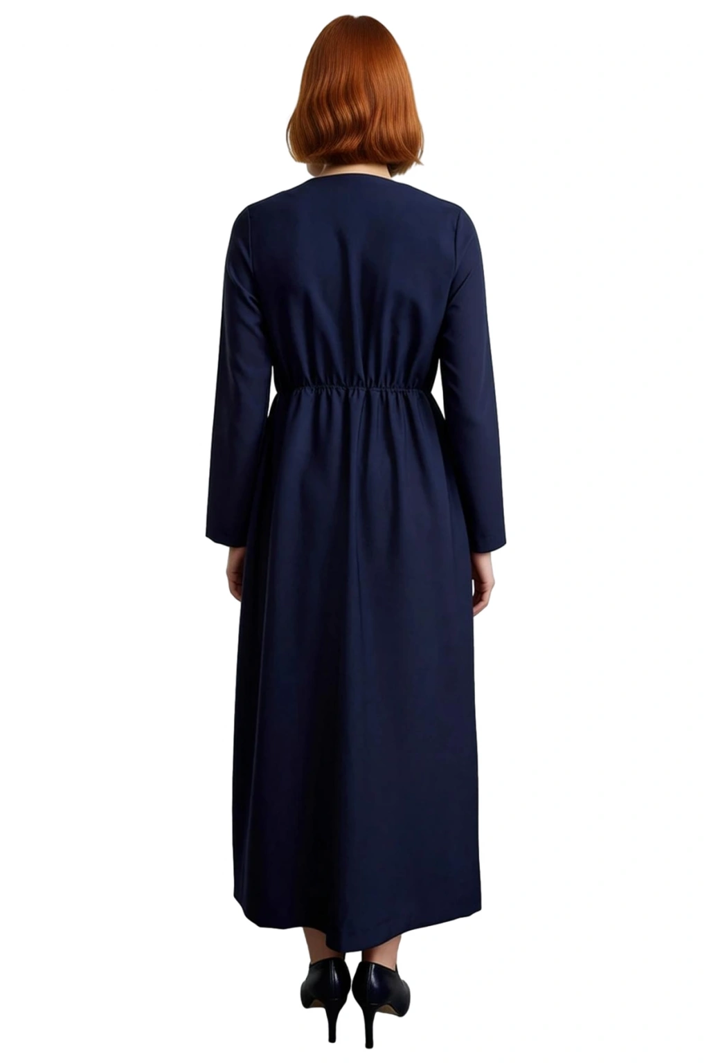 Ürün Özellikleri: A-line kalıp, polyester karışımlı materyal, düz desen, ceket yaka, standart kol, dokuma kumaş, lacivert renk, maxi boy.