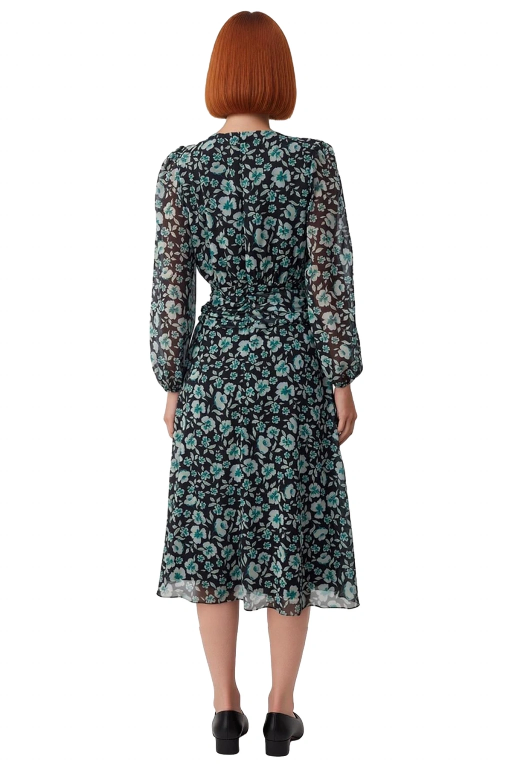 Ürün Özellikleri: A-line kalıp, %100 polyester materyal, çiçekli desen, V yaka, uzun balon kol, dokuma şifon kumaş, yeşil renk, kuşaklı detay, astarlı.