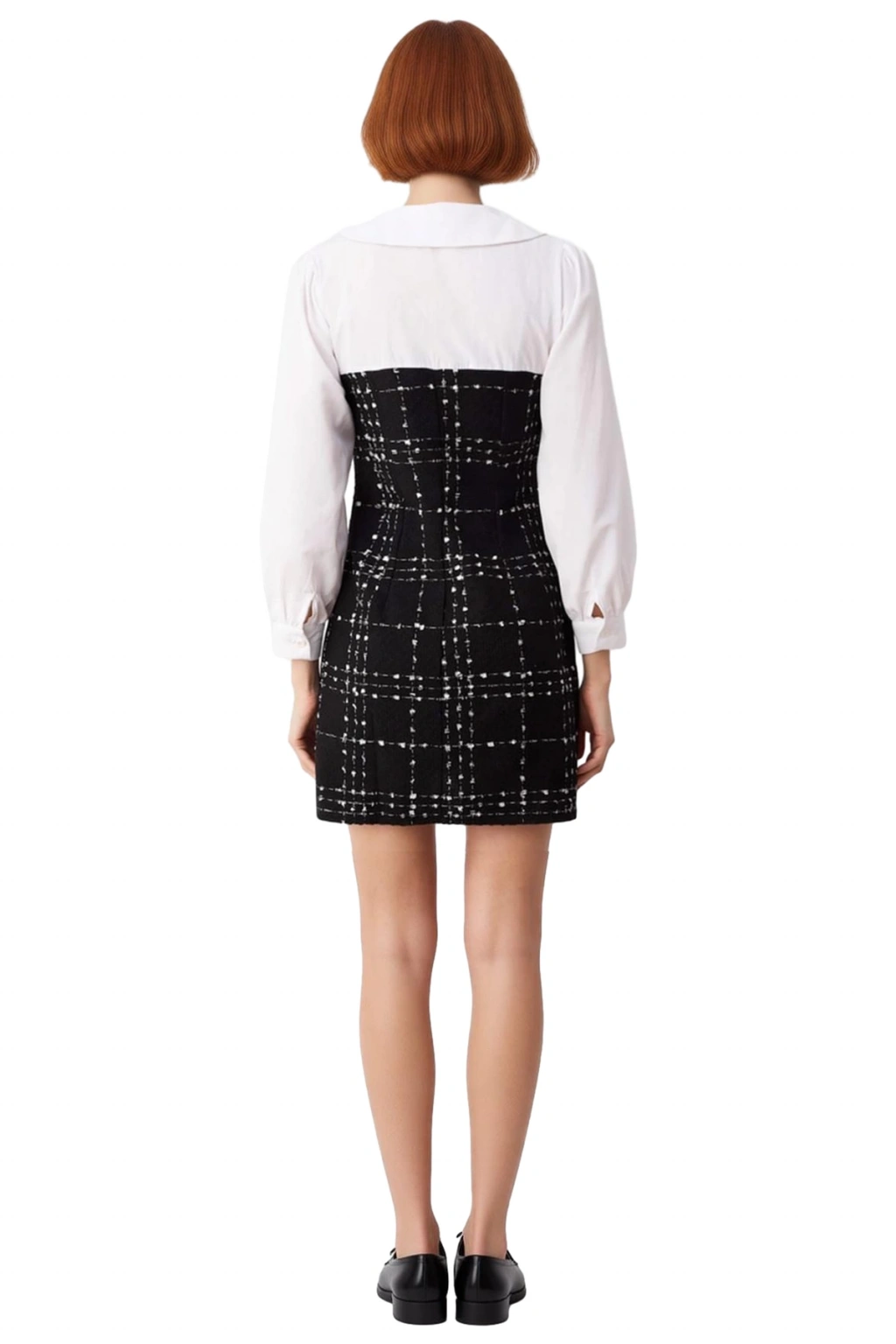 Ürün Özellikleri: A-line kalıp, dokuma materyal, kareli desen, gömlek yaka, uzun balon kol, tüvit kumaş, siyah renk, baskısız tasarım, cepsiz, mini boy.