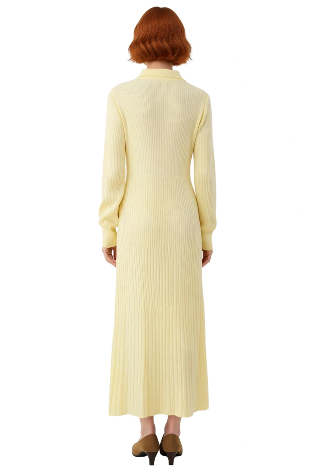 Ürün Özellikleri: A-line kalıp, 100% akrilik materyal, düz desen, polo yaka, standart uzun kol, triko ribana kumaş, sarı renk, astarsız tasarım.