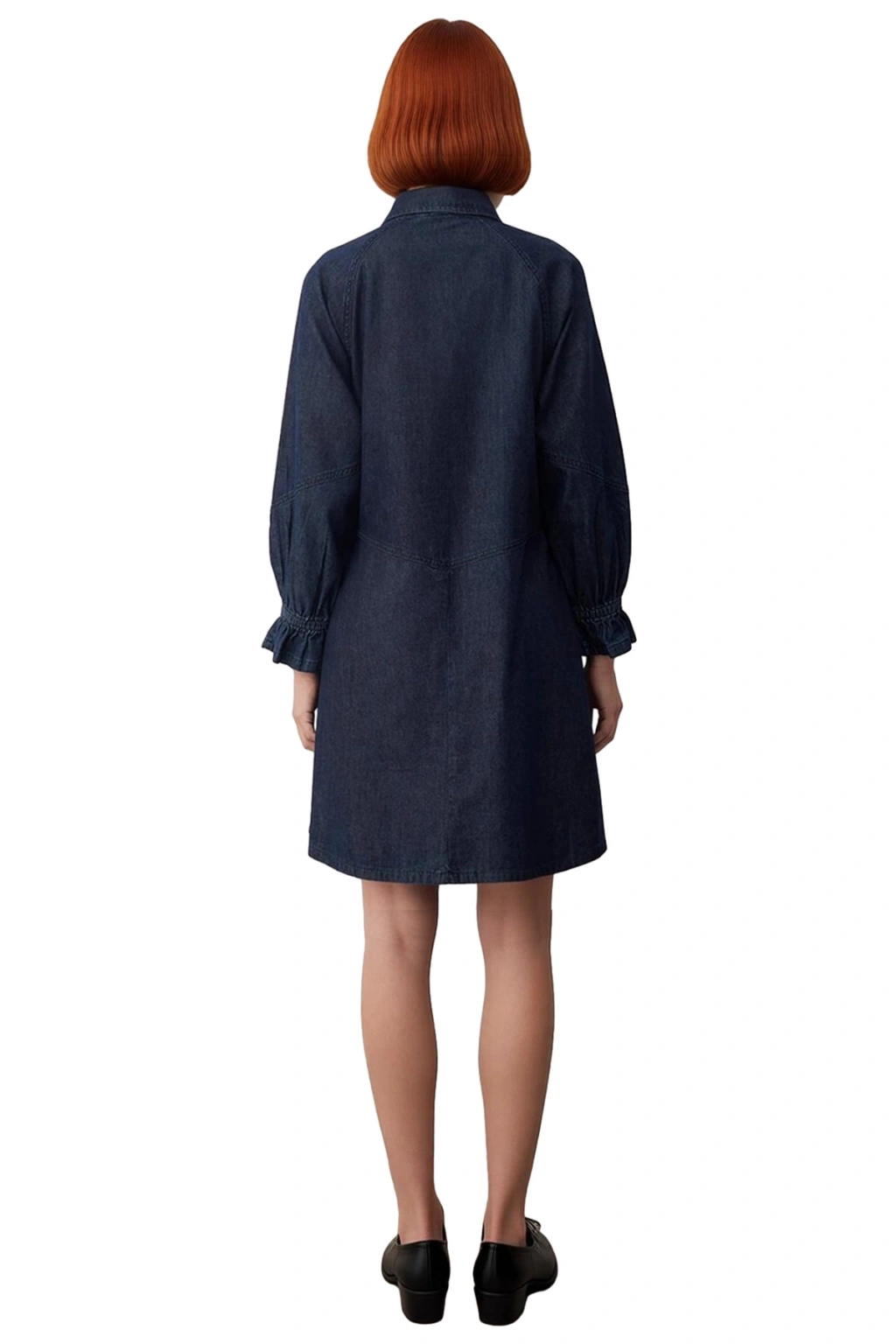 Ürün Özellikleri: A-line kalıp, %100 pamuk materyal, düz desen, gömlek yaka, büzgülü/fırfırlı uzun kol, denim kumaş, mavi renk, astarsız.