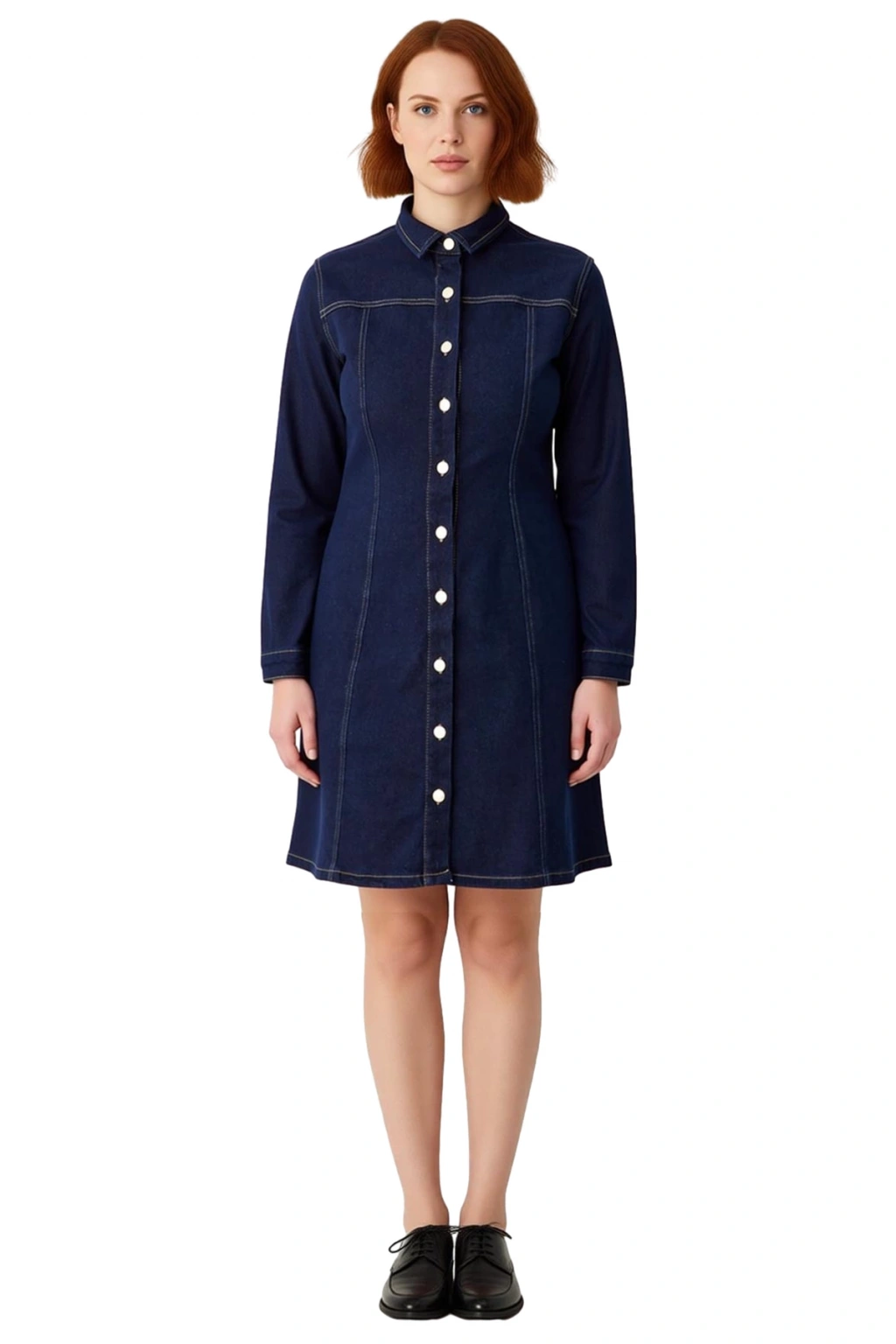 Ürün Özellikleri: A-line kalıp, denim materyal, düz desen, gömlek yaka, standart kol, denim kumaş, mavi renk.