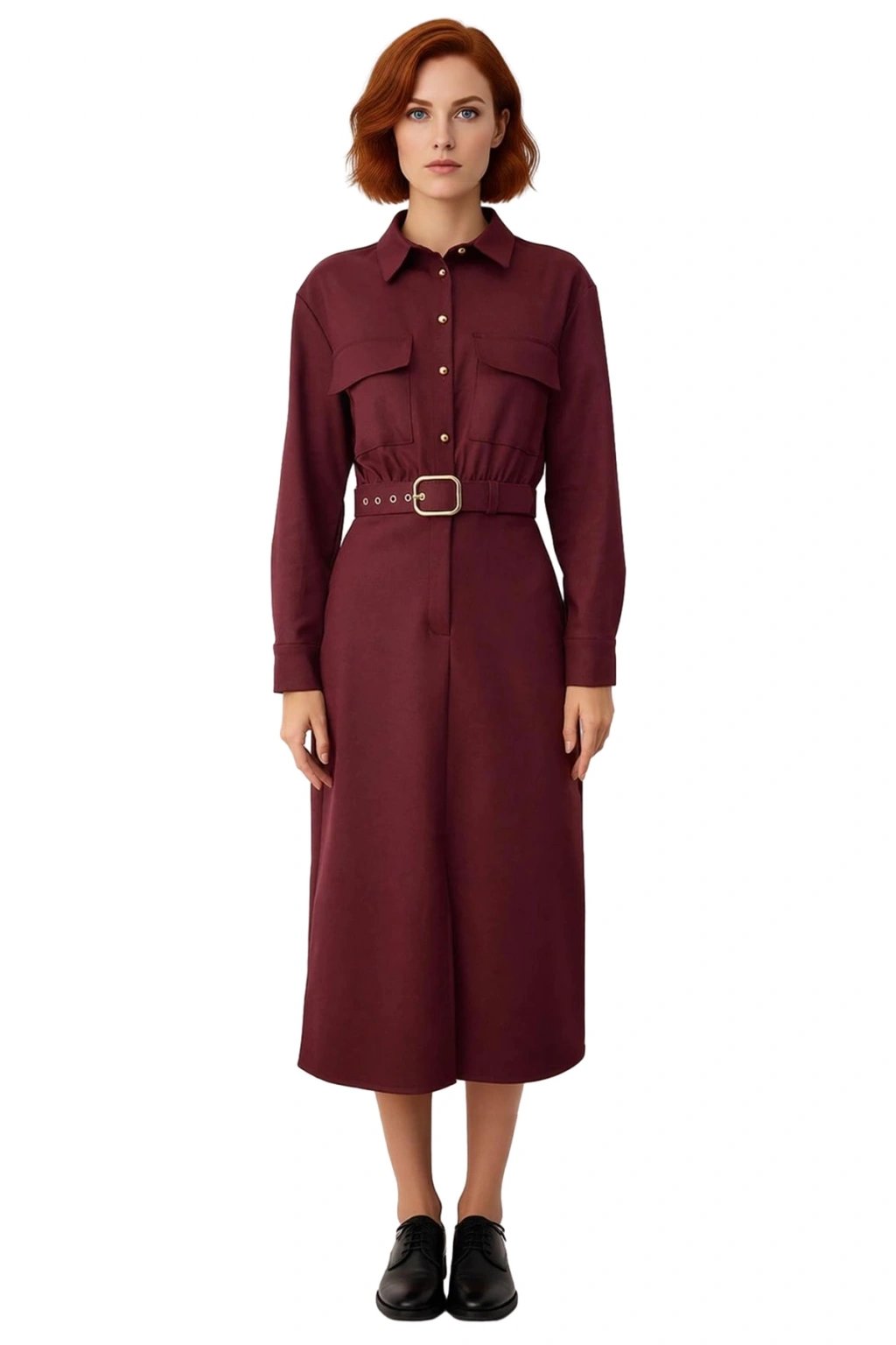 Ürün Özellikleri: A-line kalıp, polyester viskoz elastan materyal, düz desen, gömlek yaka, standart kol, flanel dokuma kumaş, bordo renk, kemerli tasarım.