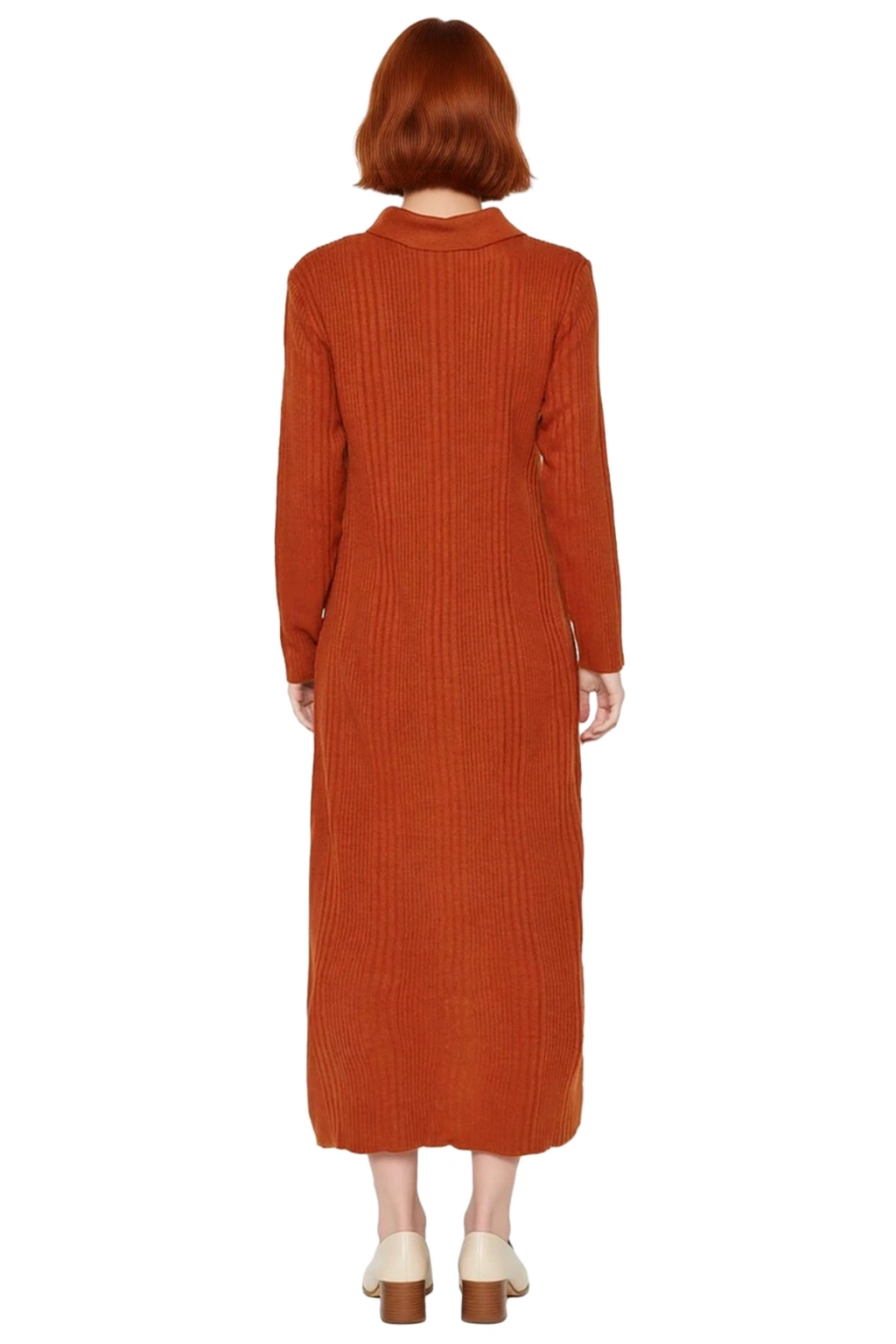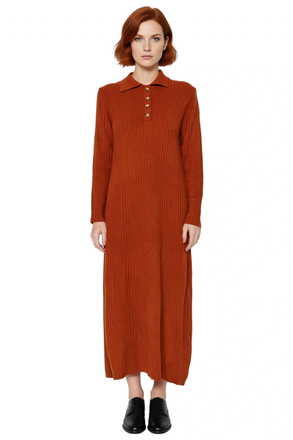 Ürün Özellikleri: A-line kalıp, akrilik materyal, düz desen, polo yaka, takma kol, triko kumaş, kiremit renk.