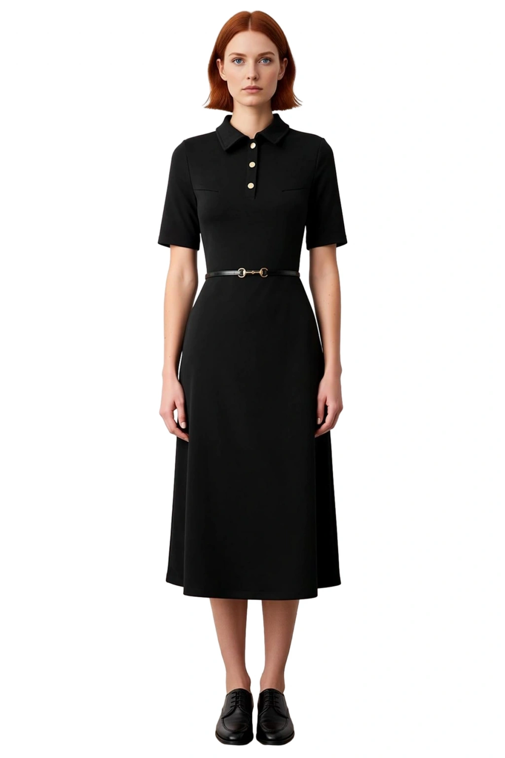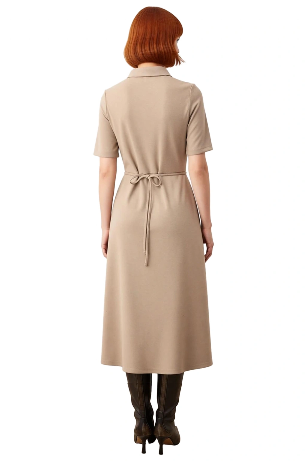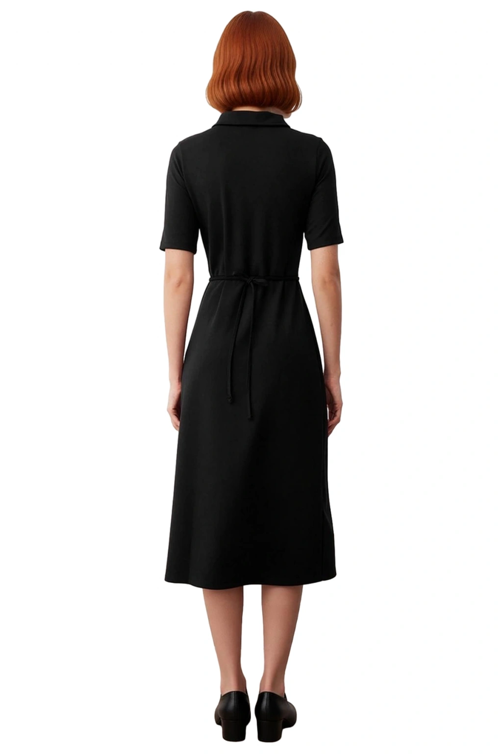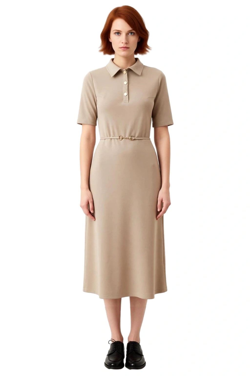 Elbisenin klasik polo yaka tasarımı, yarım pat düğme kapama detayıyla modern bir hava katarken, kolay giyip çıkarma imkanı sunar. Standart kısa kollu yapısı, hareket özgürlüğünüzü kısıtlamadan ferah bir kullanım sağlar, özellikle iç mekanlarda veya katmanlı kombinlerde idealdir. İnterlok dokuma kumaş tipi, pürüzsüz yüzeyi ve dayanıklı yapısıyla uzun süreli kullanıma uygundur ve bakımı kolaydır. Astarsız tasarımı, hafif ve nefes alabilir bir giyim deneyimi sunar. Bel kısmındaki kemer detayı, zarif bir siluet oluşturarak şıklığınızı pekiştirir ve elbiseye karakteristik bir dokunuş katar.