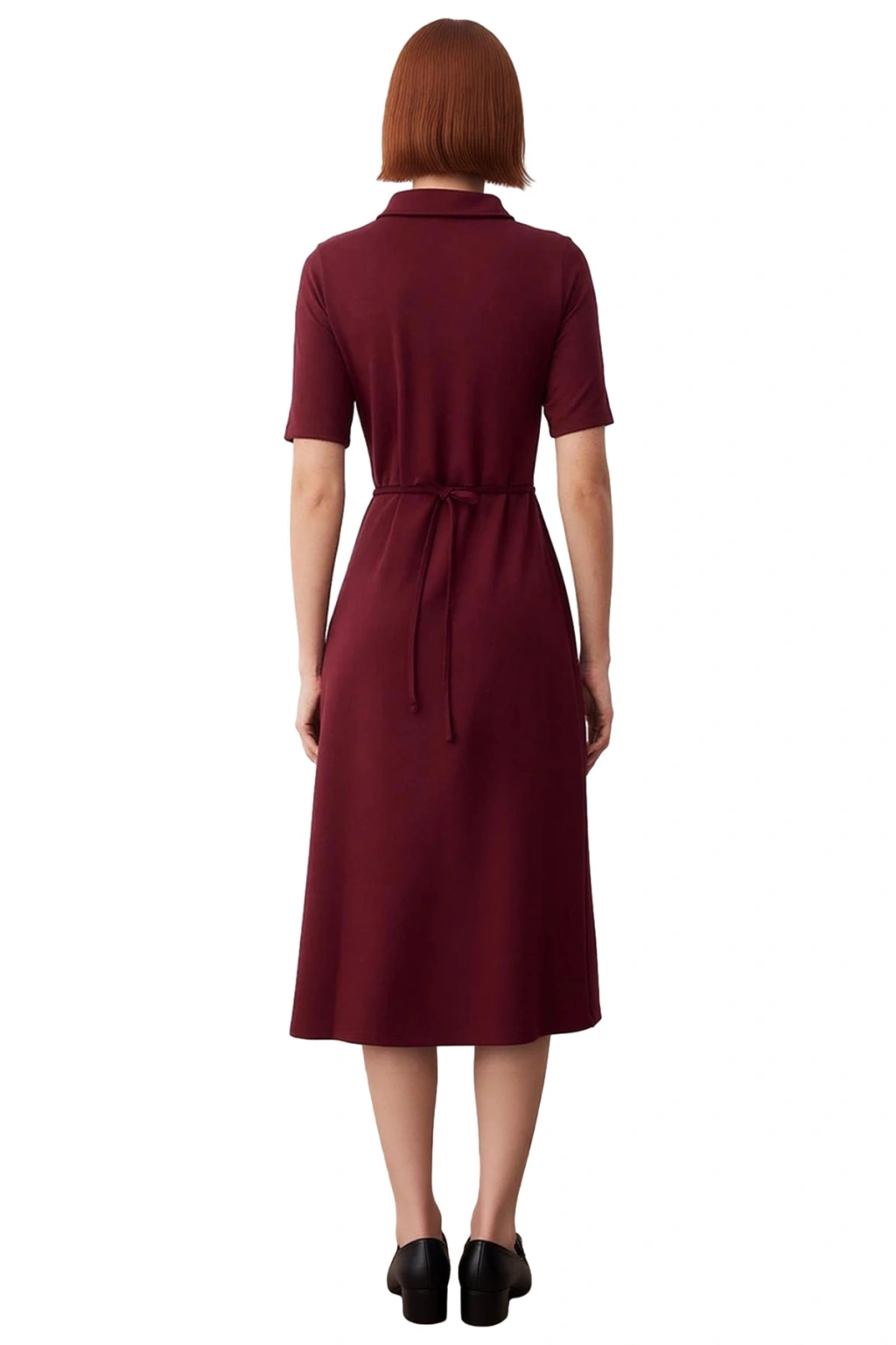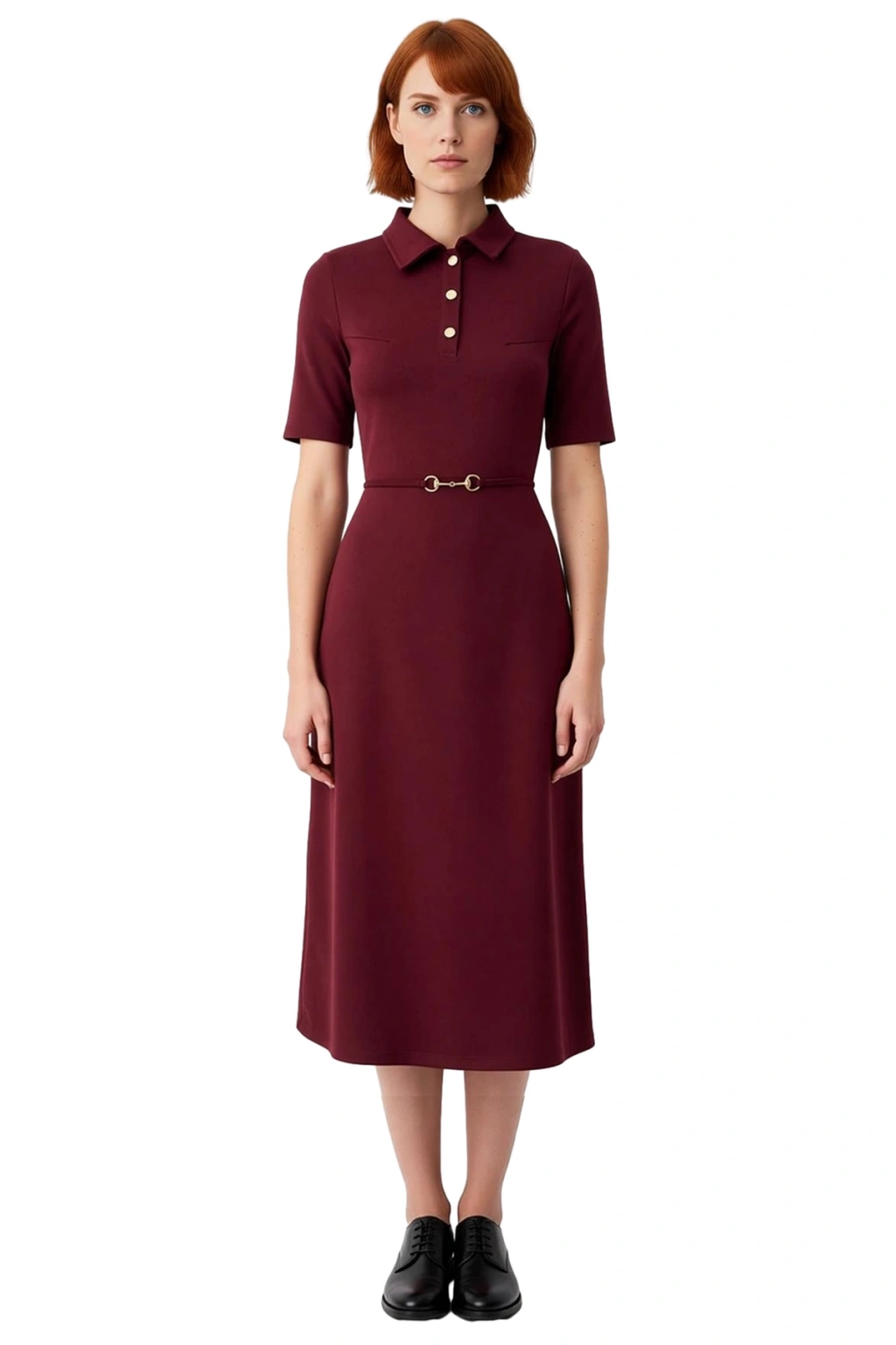 Ürün Özellikleri: A-line kalıp, %96 polyester %4 elastan materyal, düz desen, polo yaka, standart kol, interlok kumaş, bordo renk, yarım pat düğme kapama, astarsız tasarım.