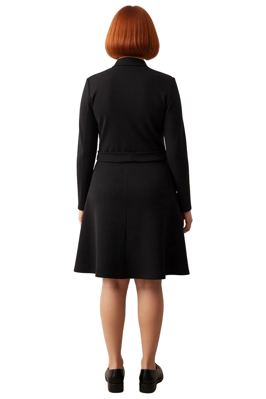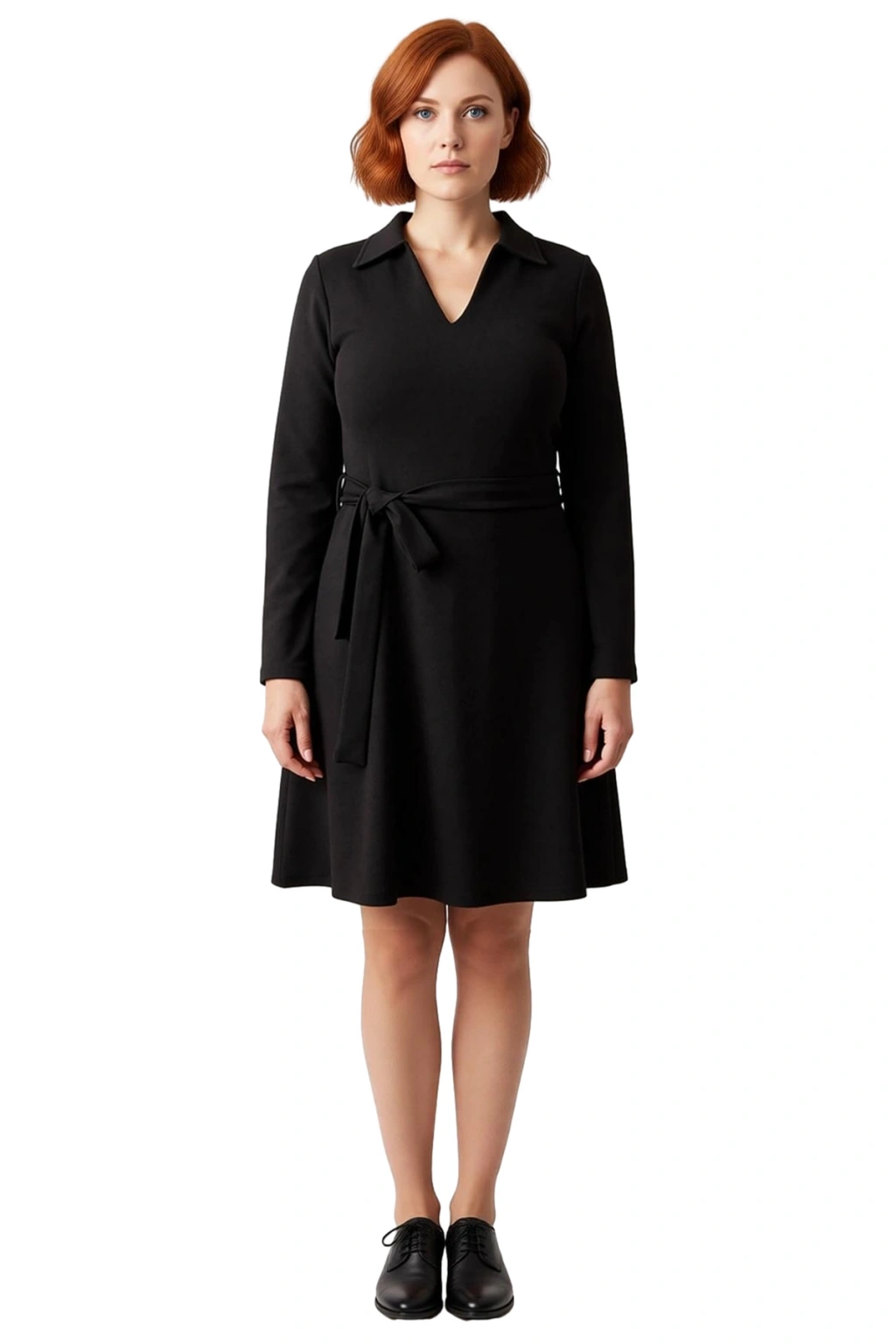 Ürün Özellikleri: A-line kalıp, polyester materyal, düz desen, polo yaka, standart kol, örme krep kumaş, siyah renk.