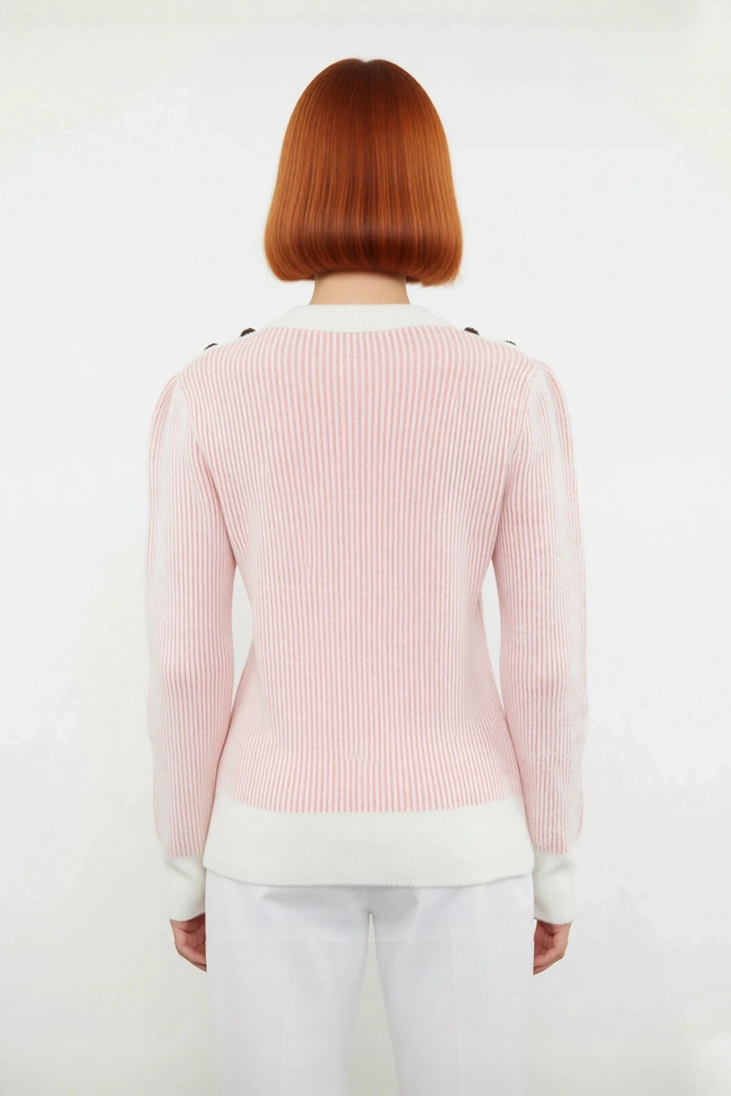 Bu Kadın Açık Mavi Çizgili Düğme Detaylı Bisiklet Yaka Triko Kazak, günlük şıklığınızı tamamlayacak ideal bir parçadır. Regular kalıbı sayesinde her vücut tipine rahatça uyum sağlar ve gün boyu konfor sunar. %77 Akrilik ve %23 Polyester materyal bileşeni, yumuşak dokusuyla cildinize nazik davranırken, soğuk havalarda sizi sıcacık tutar. Mavi ve beyazın uyumlu çizgili deseni, dinamik ve modern bir görünüm yaratır. Omuzlardaki zarif düğme detayları, bu basic siluet kazağa özgün ve çekici bir hava katarak stilinizi bir adım öne çıkarır. Bu kazak, şıklığı ve rahatlığı bir arada arayan kadınlar için vazgeçilmezdir.