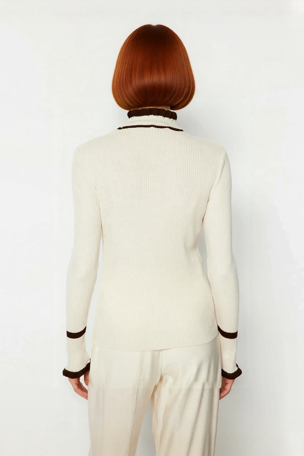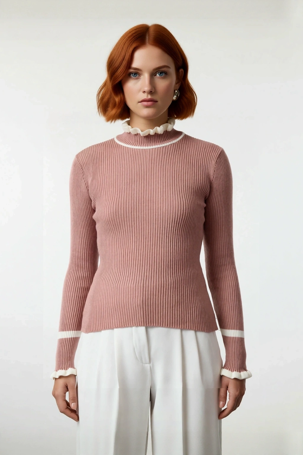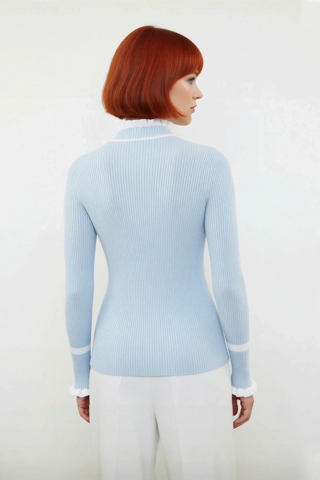 Bu kadın triko kazak, fitted kalıbı ile vücuda mükemmel bir uyum sağlayarak zarif ve modern bir duruş sergiler. %100 akrilik materyalden üretilmiş olması, kış aylarında sizi sıcacık tutarken, aynı zamanda cildinize ipeksi bir yumuşaklık sunar. Mavi rengi, yaka ve kol detaylarında kullanılan beyaz fırfırlı renk bloklarıyla zenginleştirilmiş olup, kazaka özgün ve şık bir karakter kazandırır. Fitilli dokuma tipi, görsel olarak çekici bir tekstür sunarken, basic silueti sayesinde farklı kombinasyonlara kolayca entegre edilebilir. Cepsiz tasarımı, genel estetiği sade ve akıcı tutar.