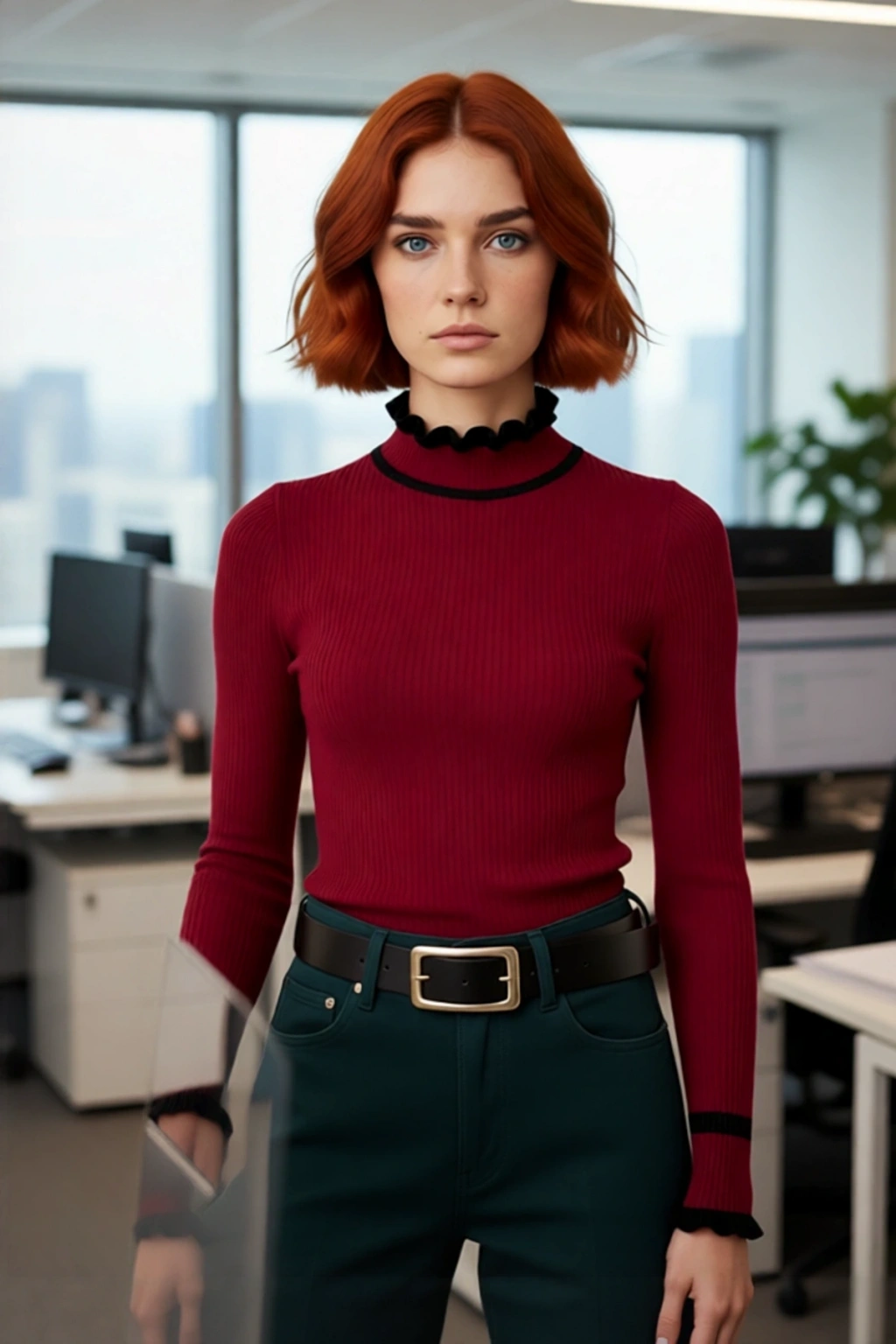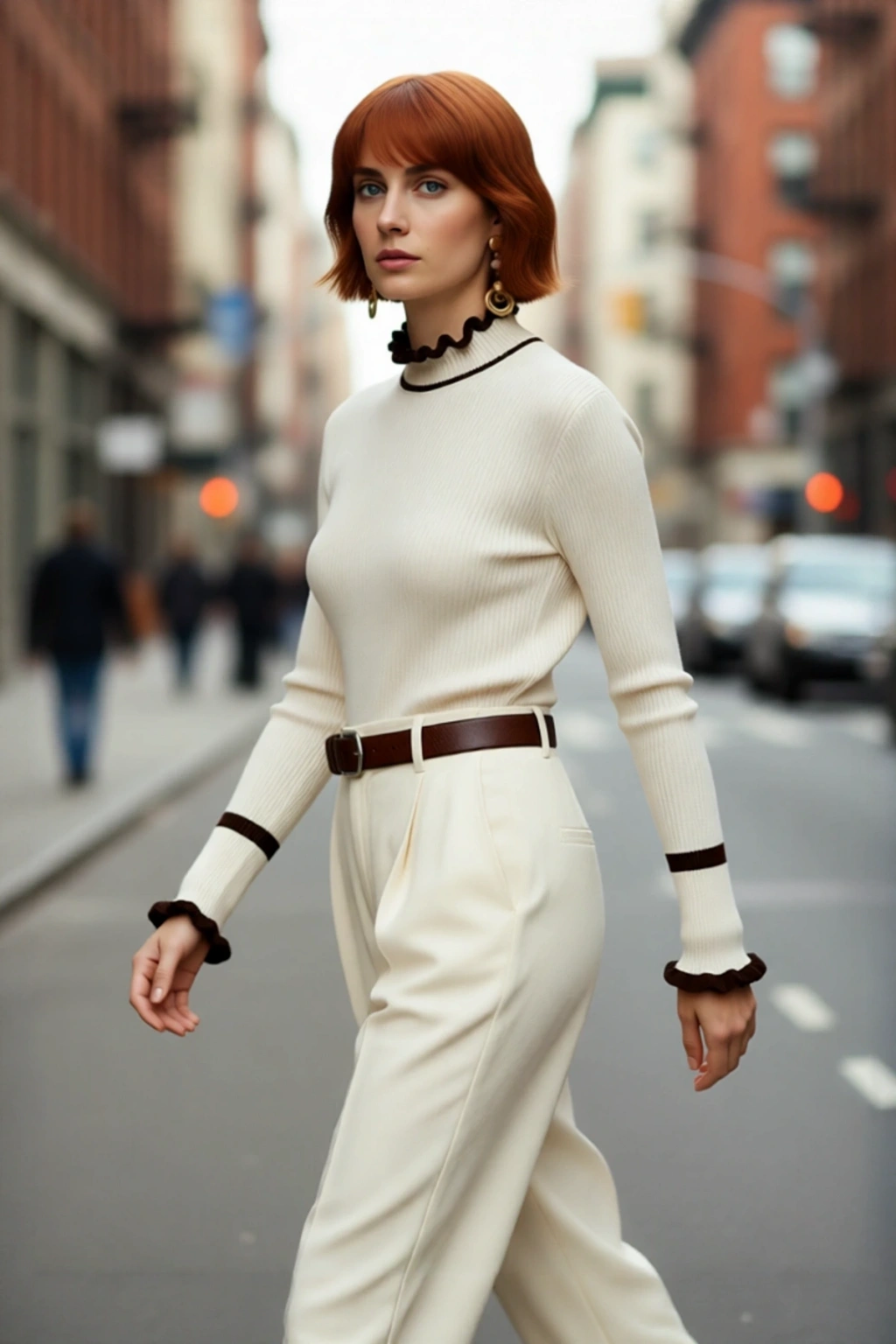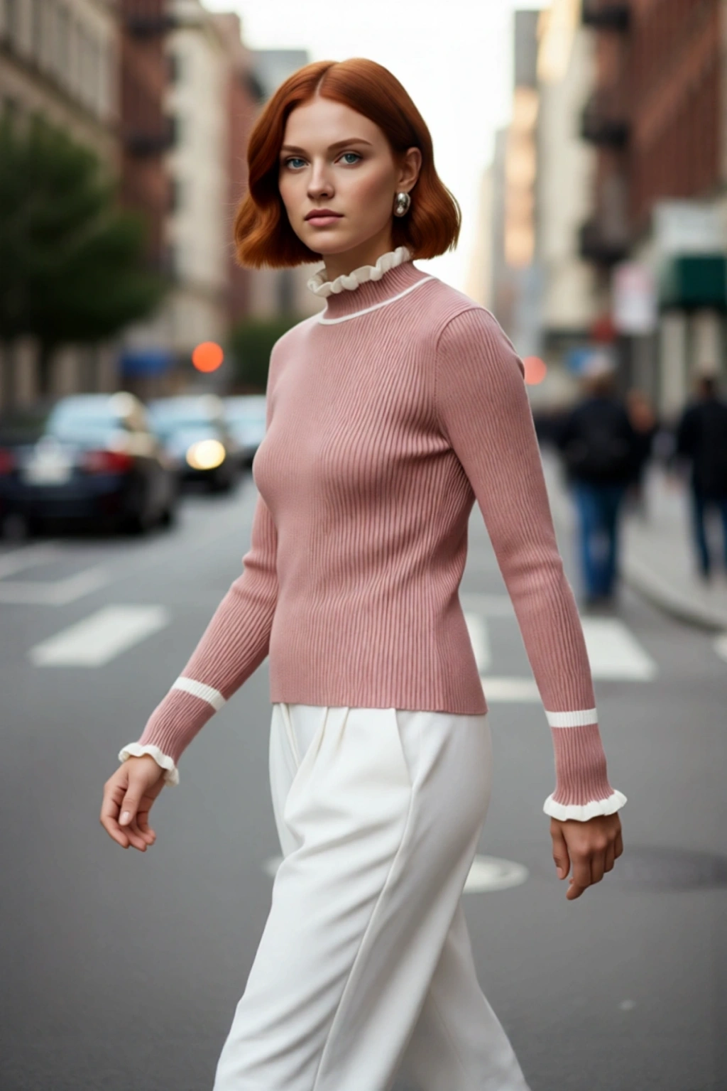 Bu kadın triko kazak, fitted kalıbı ile vücuda mükemmel bir uyum sağlayarak zarif ve modern bir duruş sergiler. %100 akrilik materyalden üretilmiş olması, kış aylarında sizi sıcacık tutarken, aynı zamanda cildinize ipeksi bir yumuşaklık sunar. Mavi rengi, yaka ve kol detaylarında kullanılan beyaz fırfırlı renk bloklarıyla zenginleştirilmiş olup, kazaka özgün ve şık bir karakter kazandırır. Fitilli dokuma tipi, görsel olarak çekici bir tekstür sunarken, basic silueti sayesinde farklı kombinasyonlara kolayca entegre edilebilir. Cepsiz tasarımı, genel estetiği sade ve akıcı tutar.