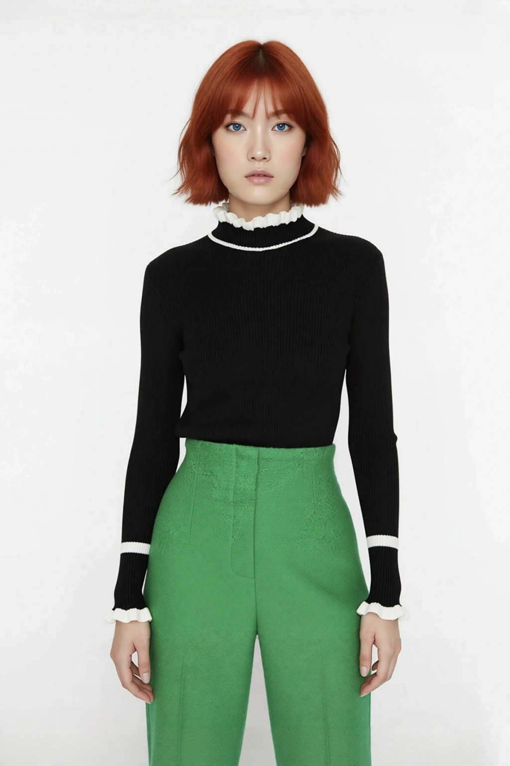 Dik yaka tasarımı, boynu nazikçe sararak soğuk havaya karşı ekstra bir koruma katmanı oluşturur ve yaka ile uzun kol manşetlerindeki fırfırlı renk bloklu detaylar, kazaka sofistike ve feminen bir hava katar. Standart kol tipi, hareket özgürlüğünü kısıtlamadan rahat bir giyim deneyimi sunar. Orta kalınlıkta triko kumaş dokusu, gün boyu nefes alabilirlik ve üst düzey konfor sağlarken, dayanıklı akrilik materyali uzun yıllar boyunca formunu korumasını garanti eder. Kemersiz yapısı pratikliği artırırken, makinede yıkanabilir olması, bakımını oldukça kolaylaştırır ve ürünün her zaman taze kalmasını sağlar.