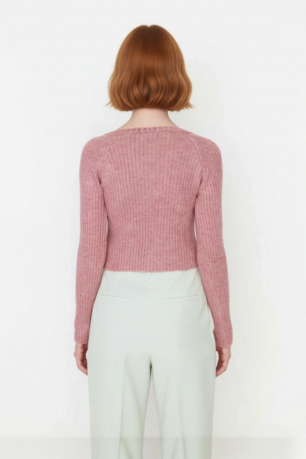 Ürün Özellikleri: Fitted kalıp, akrilik materyal, düz desen, V yaka, reglan kol, triko kumaş, pembe renk, cepsiz tasarım.