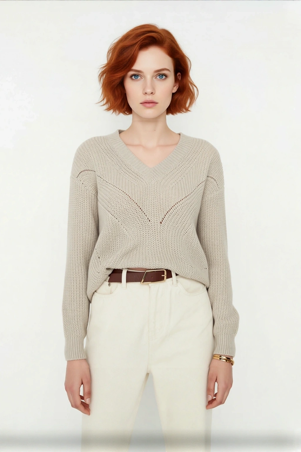 Bu şık Kadın Akrilik Triko Kazak, ajurlu deseni ve elegan V yaka kesimiyle kış gardırobunuzun yıldız parçası olmaya aday. Regular kalıbı, bedene nazikçe oturarak hem rahatlık hem de modern bir görünüm sunar. %100 akrilik materyalden üretilen bu kazak, soğuk havalarda üstün izolasyon sağlarken, aynı zamanda inanılmaz derecede yumuşak bir his verir. Gri rengiyle her stile uyum sağlayan bu ürün, casual/günlük kombinlerinizi zahmetsizce tamamlar ve Cool & Comfort personasını kusursuzca yansıtır.