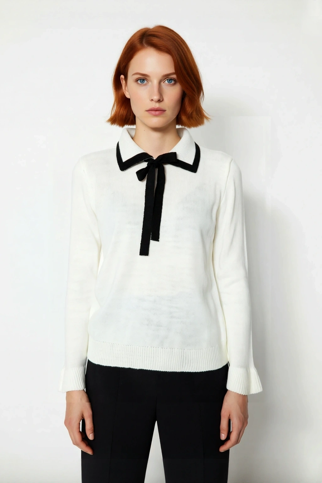 Ön plana çıkan polo yaka tasarımı, bağcıklı ek özelliği ile zenginleştirilerek ürüne klasik ve sofistike bir hava katar. Bu detay, kazaka feminen bir şıklık verir. Standart uzun kol tipi, günlük aktivitelerinizde rahat hareket etmenizi sağlarken, triko kumaş dokusu nefes alabilirlik ve esneklik sunar. Baskısız sade yapısı ve tek plaka dokuma tekniği, ürünün zamansız ve kaliteli görünümünü destekler. Makinede yıkanabilir olması, kullanım ve bakım kolaylığı açısından büyük avantaj sağlar.