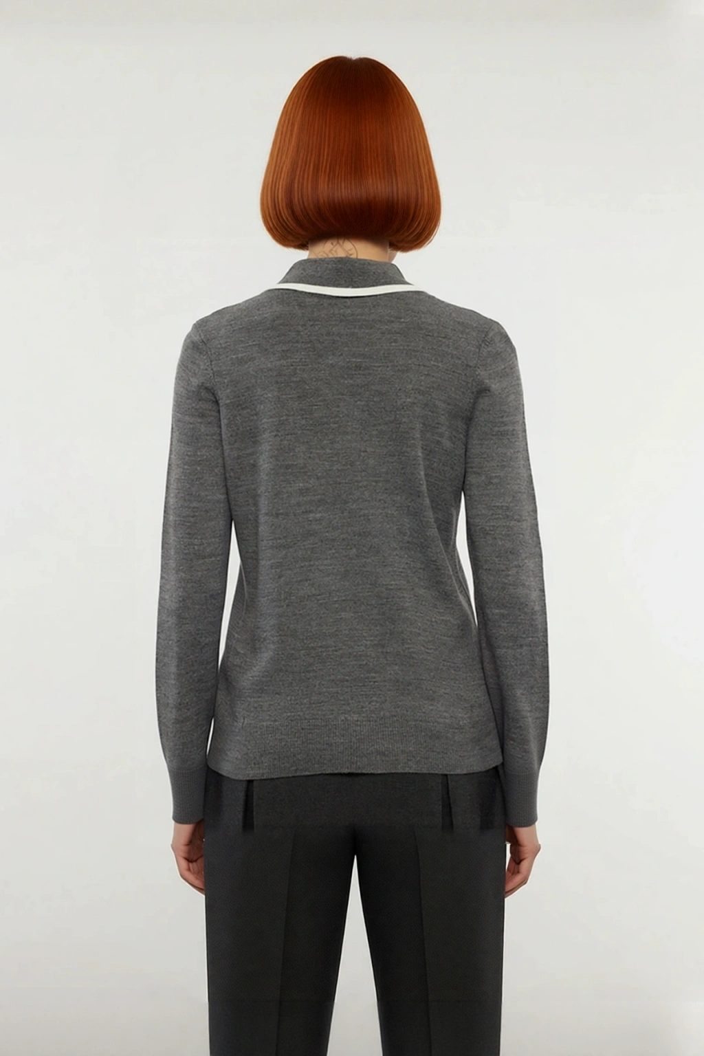 Ürün Özellikleri: Regular kalıp, akrilik materyal, renk bloklu desen, polo yaka, standart kol, triko kumaş, gri renk.