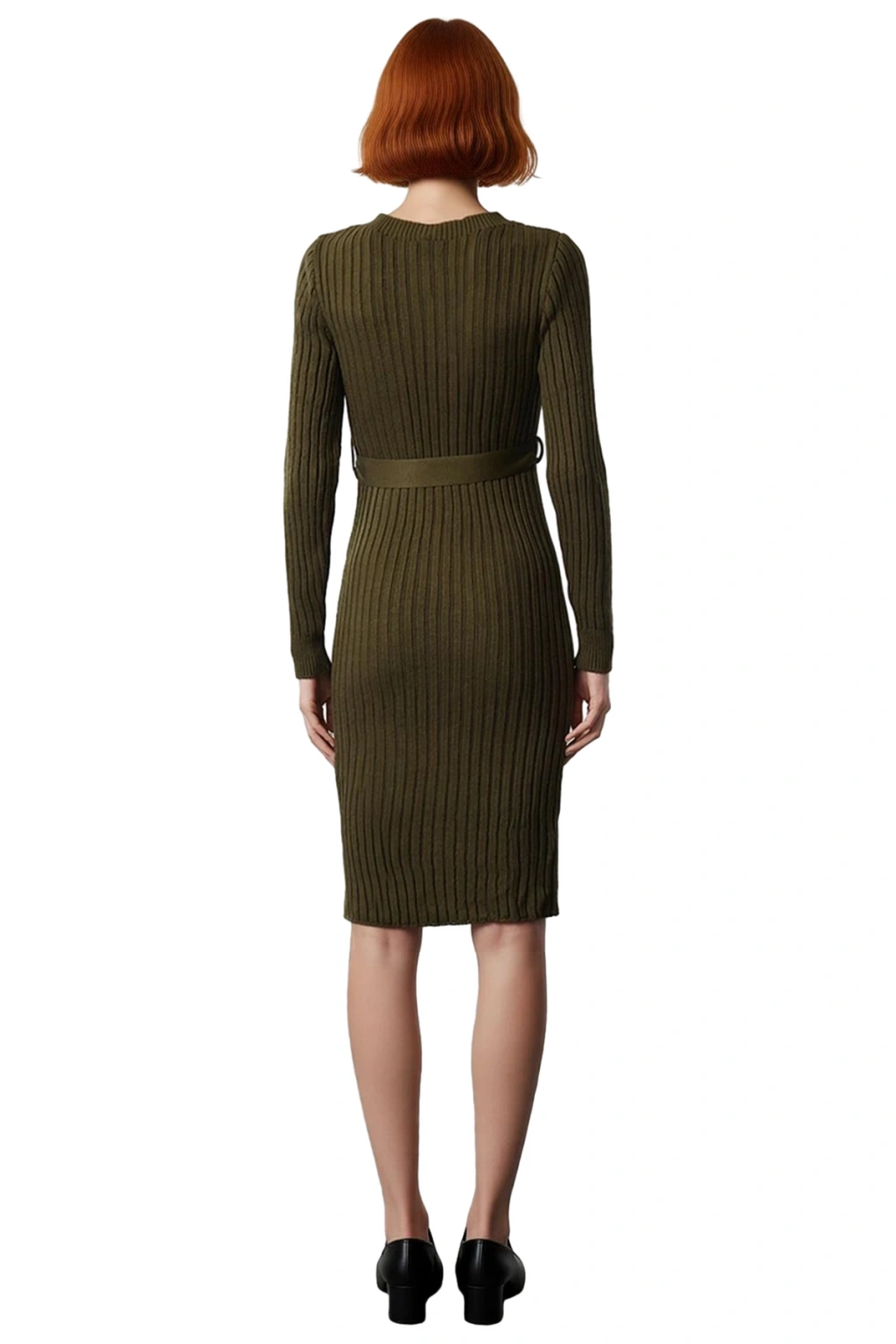 Ürün Özellikleri: A-line kalıp, %100 akrilik materyal, düz desen, bisiklet yaka, uzun standart kol, triko kumaş, haki renk, kemerli, astarsız, cepsiz, midi boy.