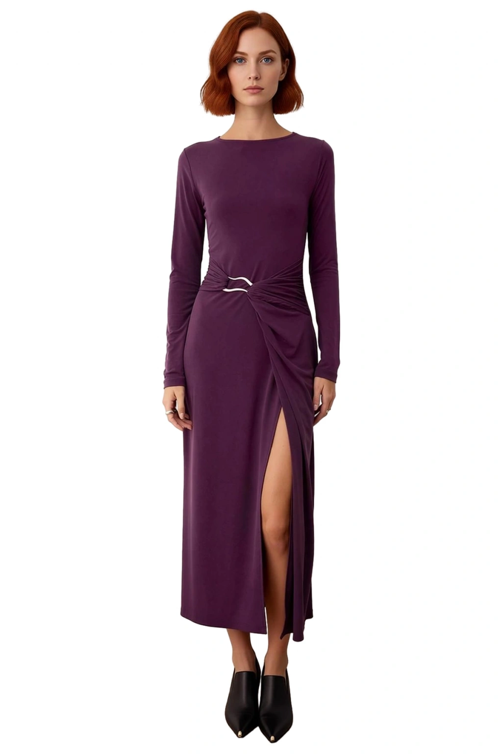 Ürün Özellikleri: Bodycon kalıp, 96% Polyester 4% Elastan materyal, düz desen, kayık yaka, düşük kol, örme kumaş, mor renk, aksesuar detaylı tasarım.