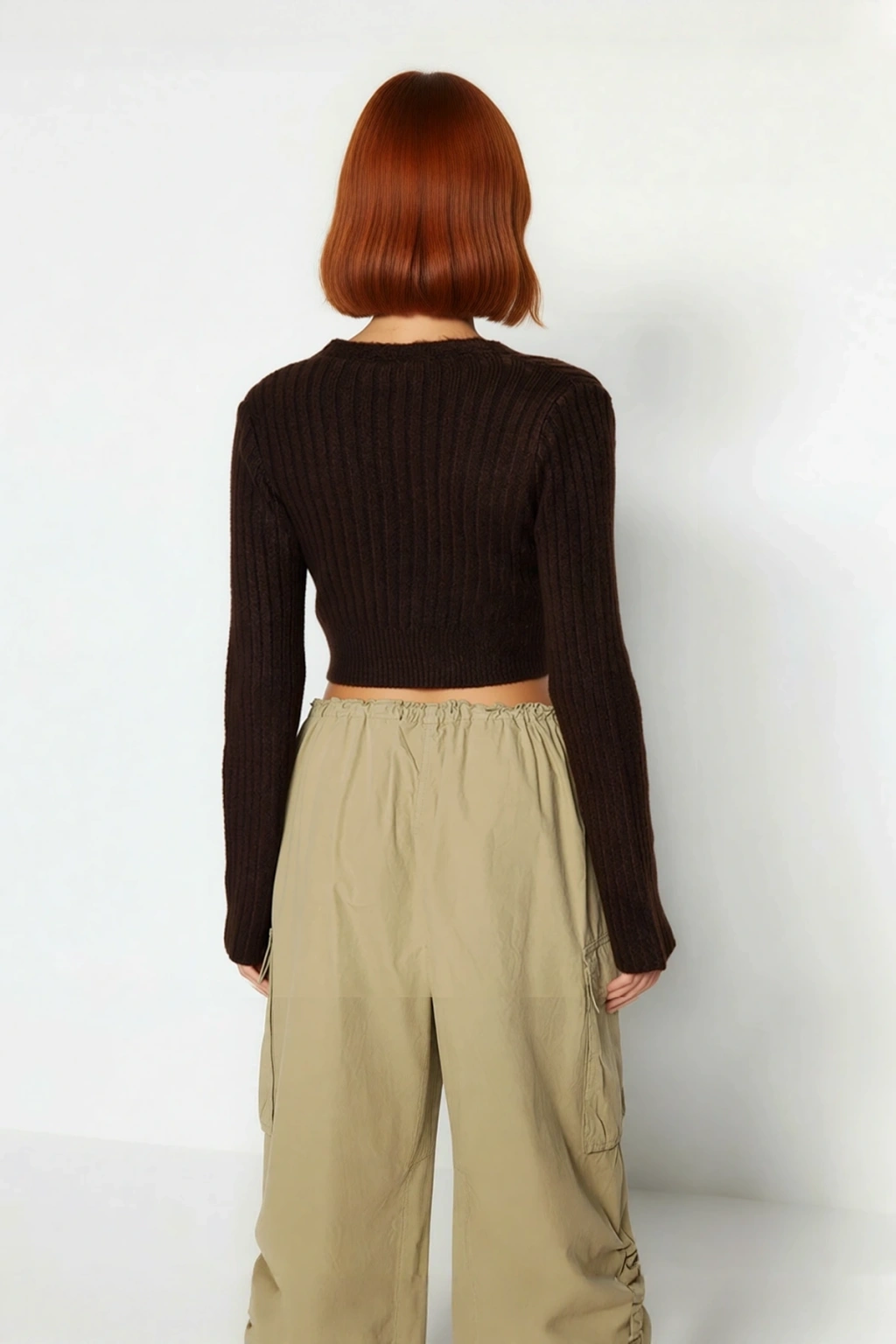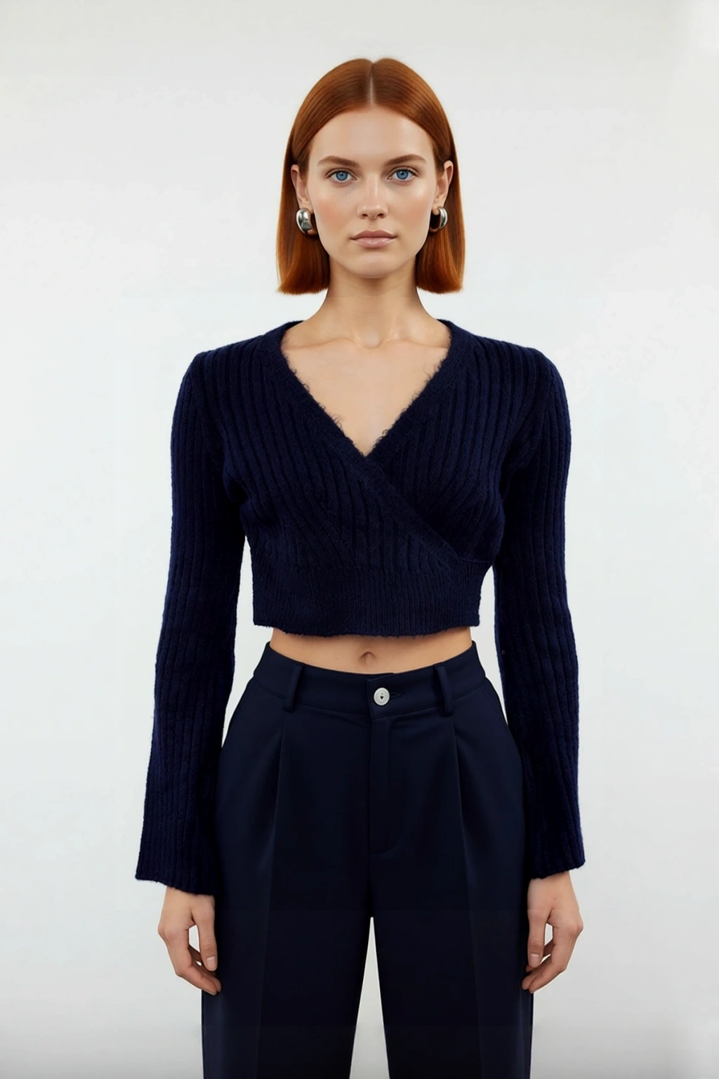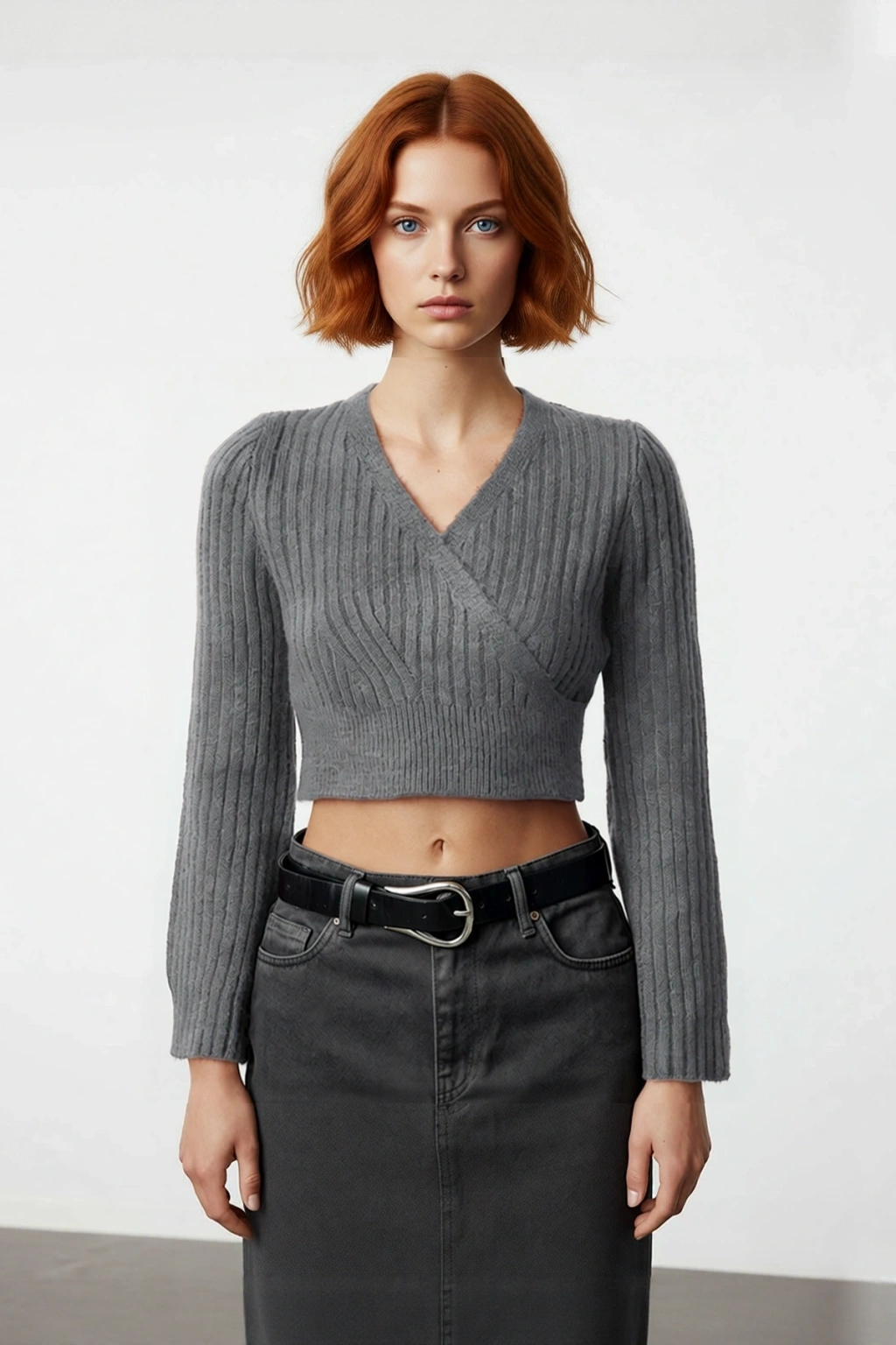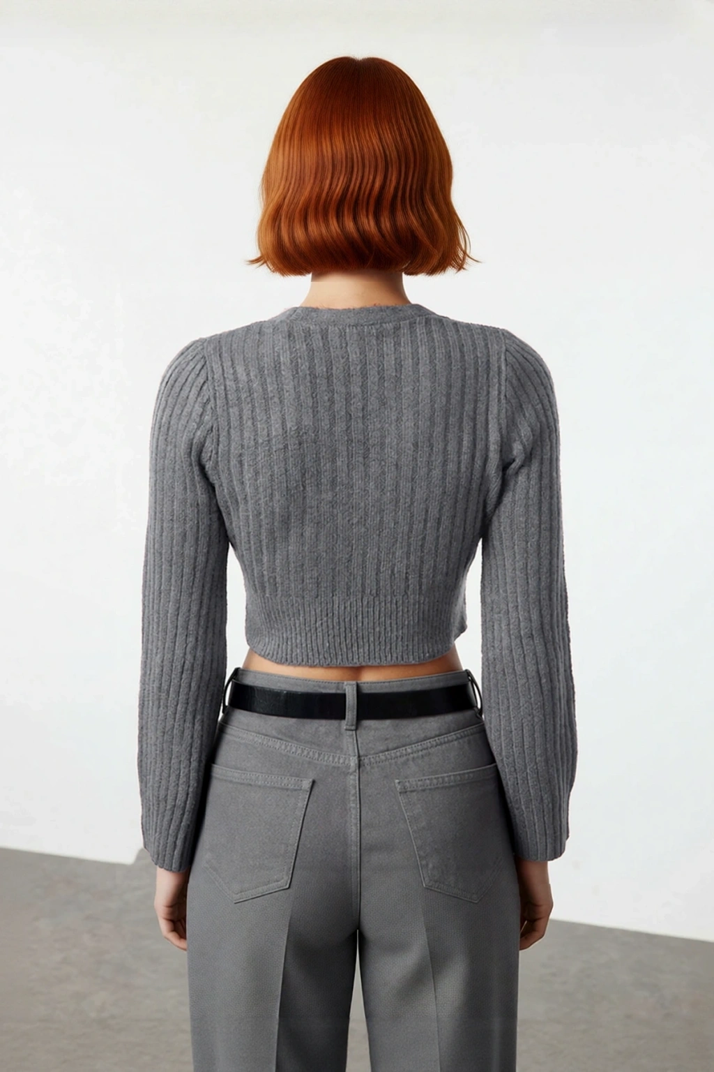Ürün Özellikleri: Fitted kalıp, akrilik polyester materyal, fitilli desen, kruvaze yaka, standart kol, triko kumaş, antrasit renk, crop boy.