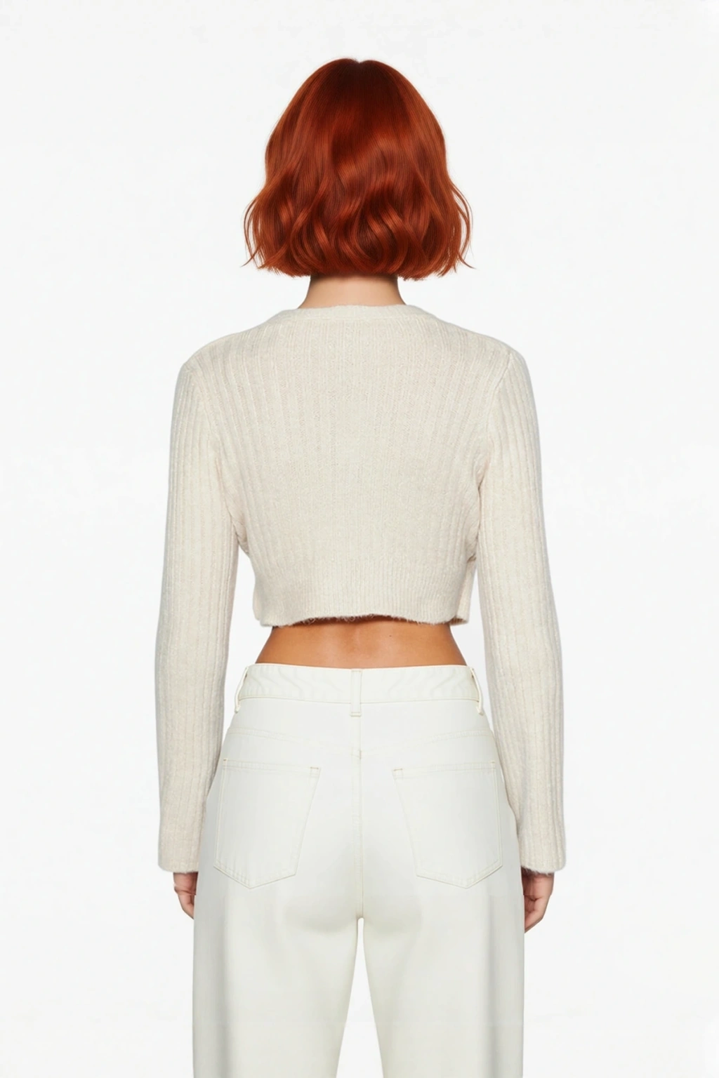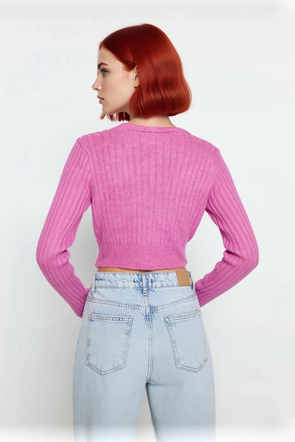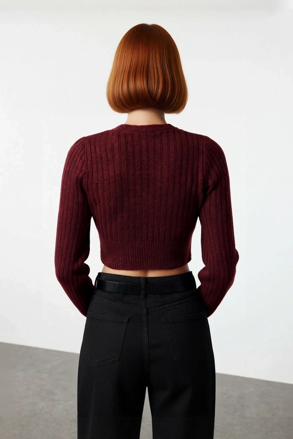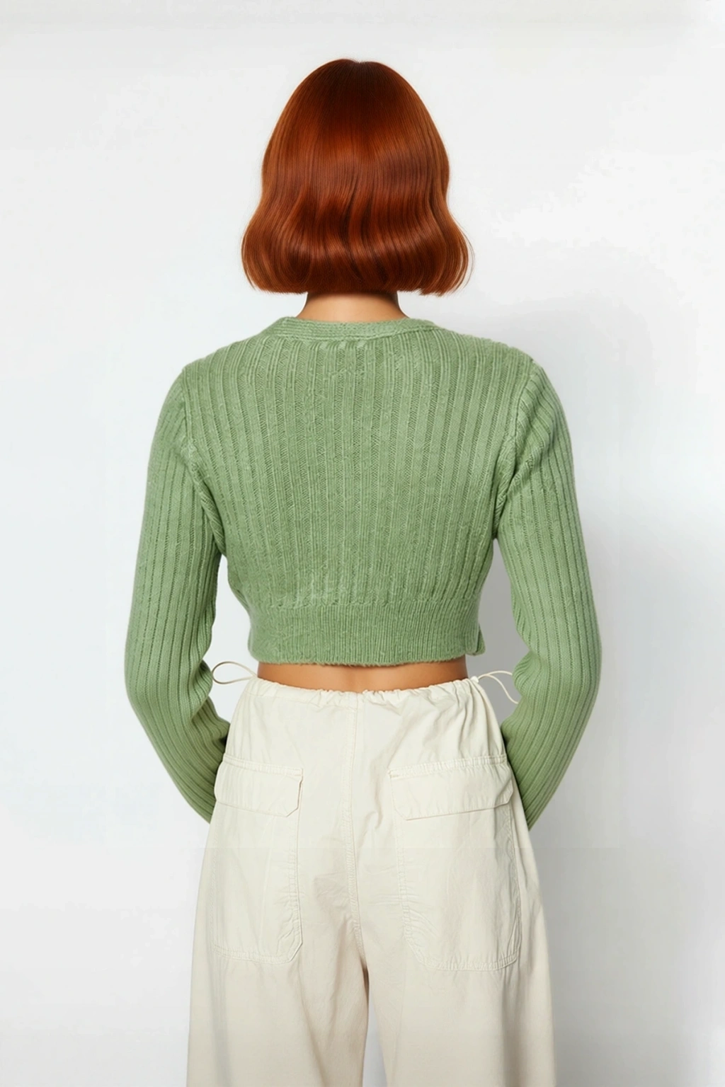 Ürün Özellikleri: Fitted kalıp, akrilik polyester materyal, fitilli desen, kruvaze yaka, standart kol, triko kumaş, antrasit renk, crop boy.