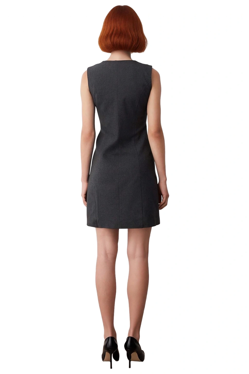 Ürün Özellikleri: Gömlek elbise kalıp, %100 polyester materyal, düz desen, bisiklet yaka, kolsuz, dokuma kumaş, antrasit renk, düğmeli kapama.