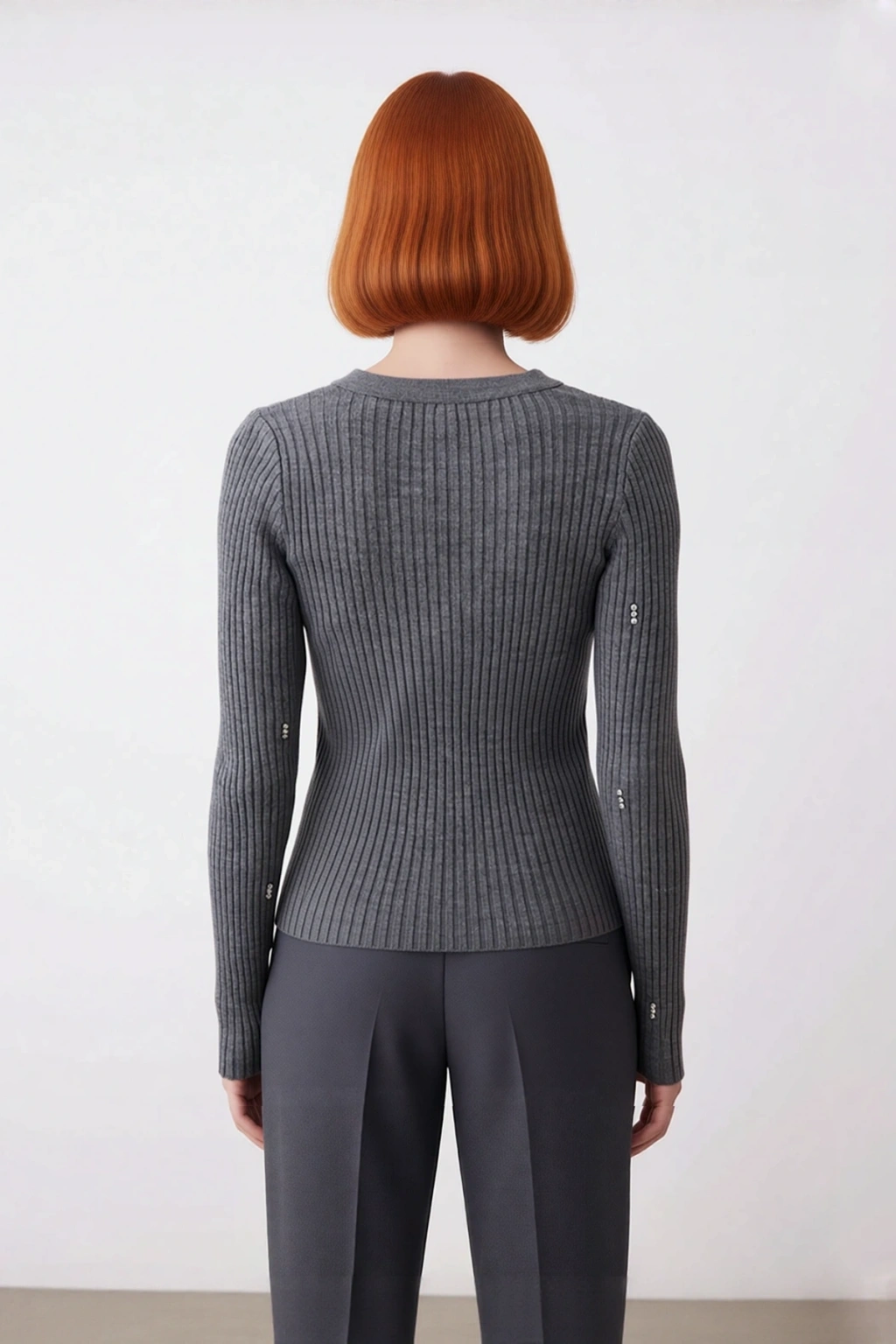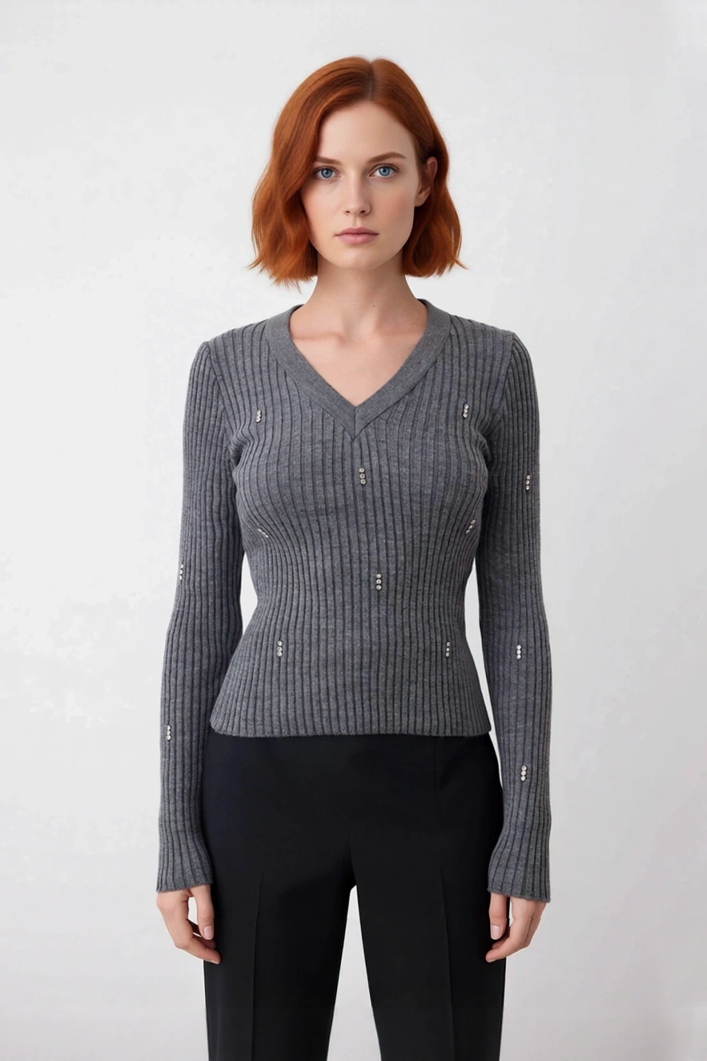 Ürün Özellikleri: Fitted kalıp, %100 akrilik materyal, taş işlemeli desen, V yaka, standart kol, fitilli triko kumaş, antrasit renk.