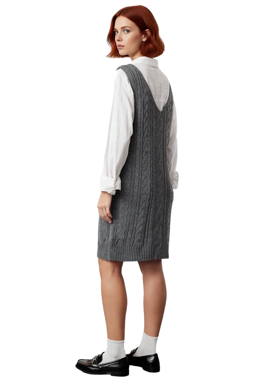 Ürün Özellikleri: Jile kalıp, akrilik materyal, saç örgü desen, V yaka, kolsuz, triko kumaş, antrasit renk.